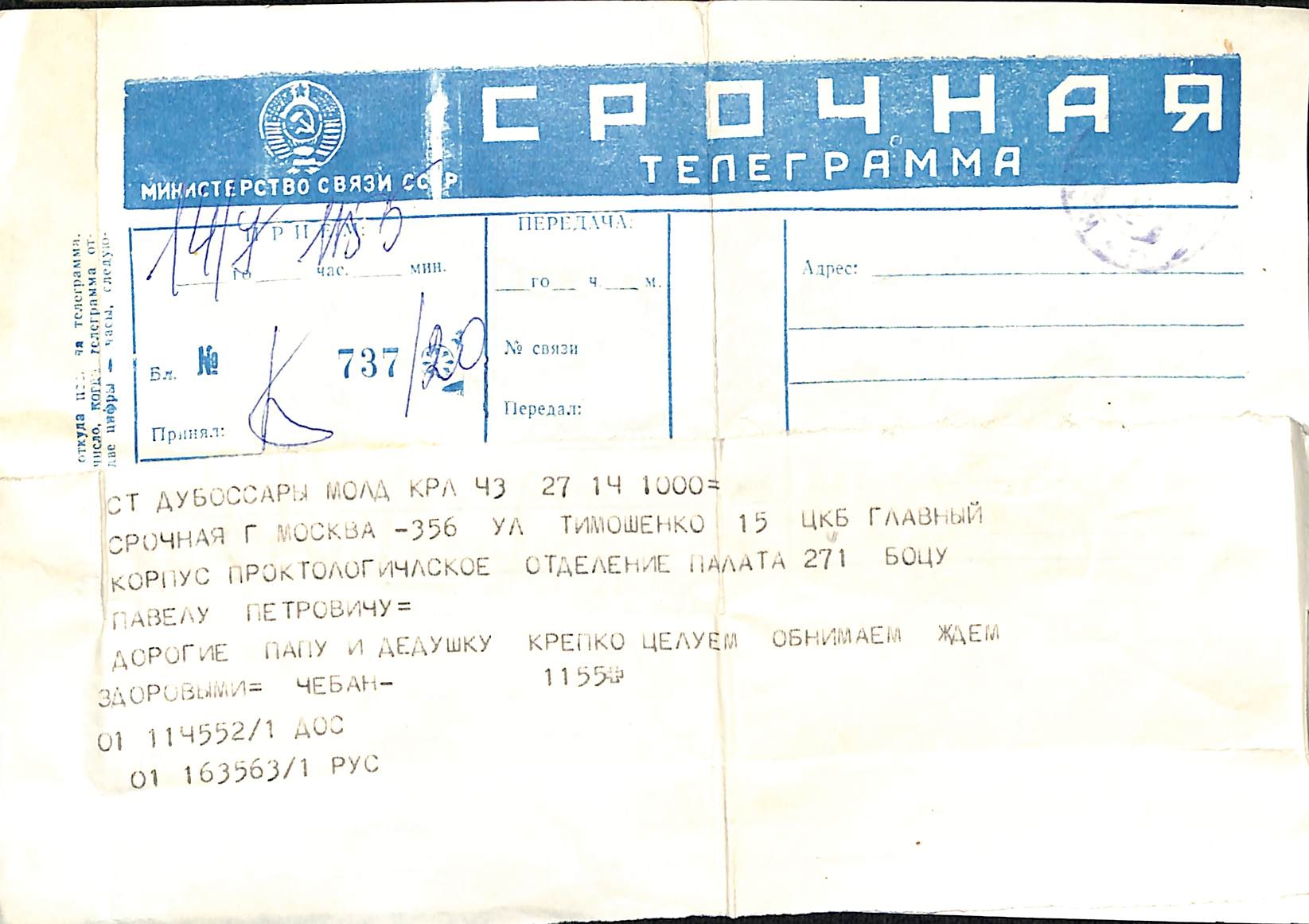 Boțu, Pavel. Manuscris dactilografiat. Ministerul Telecomunicațiilor din URSS, Telegramă urgentă adresată lui Pavel Boțu de la membrii familiei din data de 14. 07. 1986. Telegrama este telegrafiată/dactilografiată în limba rusă pe un formulat-tip cu antetul instituției în culoare albastră. În partea stângă sus este imprimată stema URSS. Pe verso: este aplicată ștampila oficiului poștal cu înscrisul: „Москва. 14. 07. 86”.