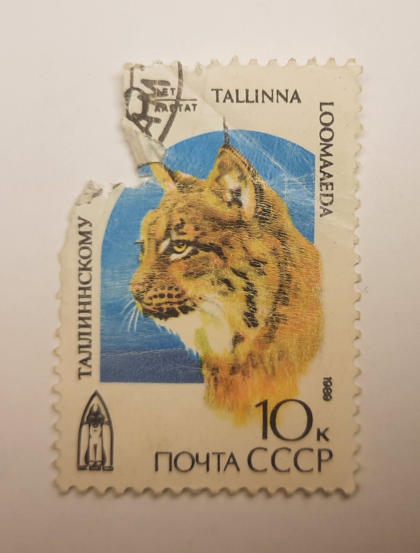 Sus, pe marca poștală, spre dreapta scrie "TALLINNA", și pe verticală ”LOOMAAEDA” iar jos, pe dreapta este indicat valoarea mărcii poștale, ”10к”, dedesubt ”ПОЧТА СССР”, pe verticală, anul emiterii, ”1989”. pe mijlocul mărcii poștale este reprezentată o imagine cu un tigru. Pe partea stângă, pe verticală este scris ”ТАЛЛИННСКОМУ” (doar atât este vizibil din motiv că colțul stâng de sus al mărcii poștale, este rupt.