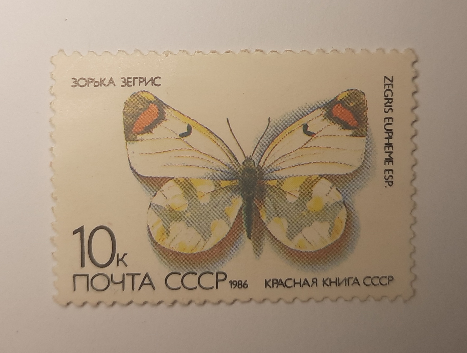 Pe mijlocul mărcii poștale este reprezentată o imagine cu un fluture de culoare alb cu galben. Sus, pe stânga, este indicată denumirea, ”ЗОРЬКА ЗЕГРИС”, iar pe dreapta, pe verticală, ”ZEGRIS EUPHEME ESP.”. Jos, pe stânga, este scris valoarea mărcii poștale, ”10к”, dedesubt, ”ПОЧТА СССР” și anul emiterii, ”1986”, iar pe dreapta, ”КРАСНАЯ КНИГА СССР”.