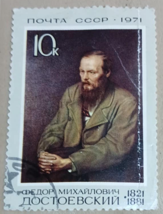 Timbru poștal emis de URSS în anul 1971, cu valoarea nominală de 10 copeici, dedicat scriitorului rus F. M. Dostoievski, la aniversarea a 150 de ani de la nașterea sa.