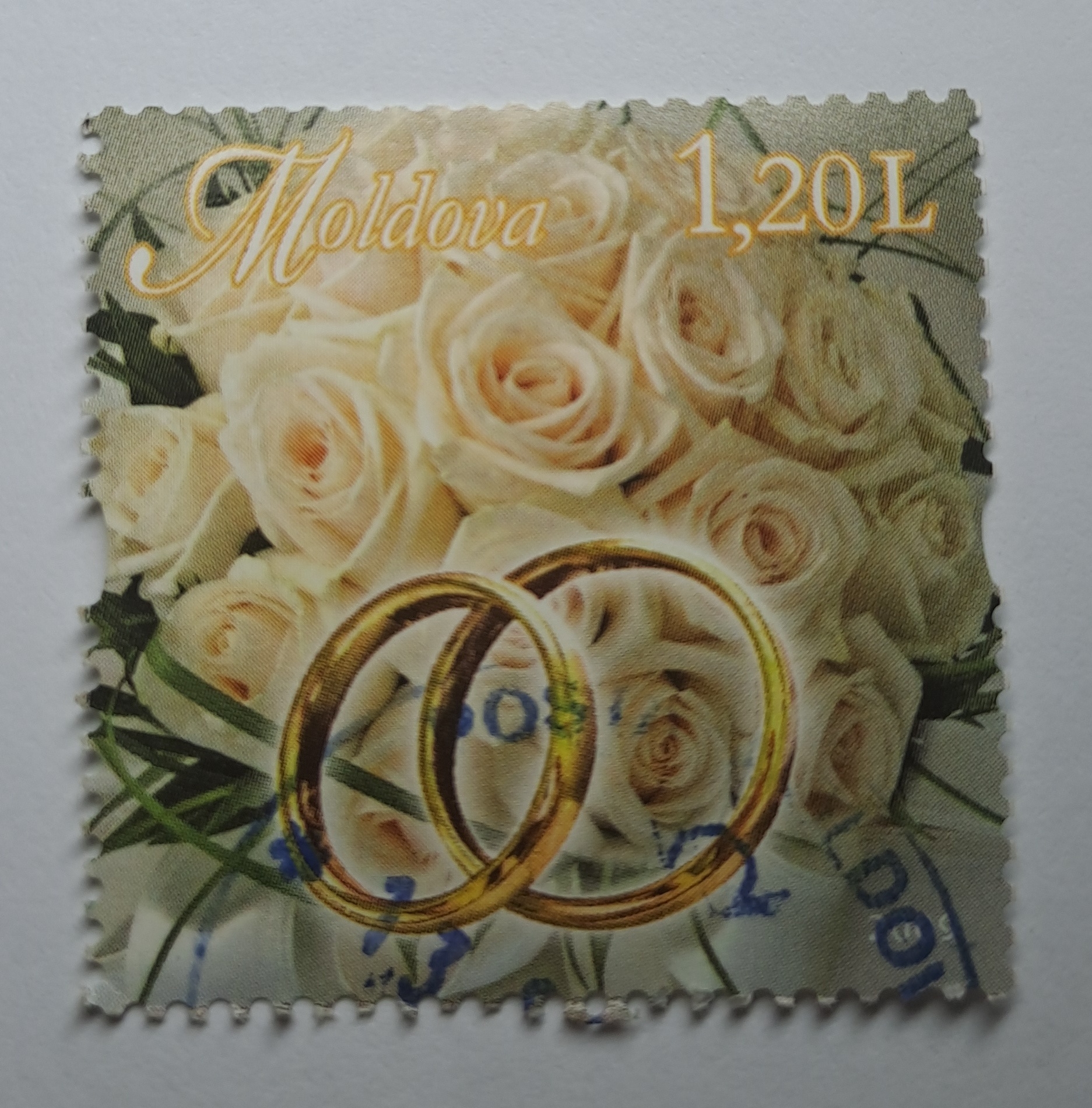 Pe marca poștală este reprezentată o imagine cu un buchet de trandafiri albi și 2 inele de cununie. Sus, pe stânga, denumirea țării, ”MOLDOVA”, și pe dreapta valoarea mărcii poștale, ”1,20L”.
