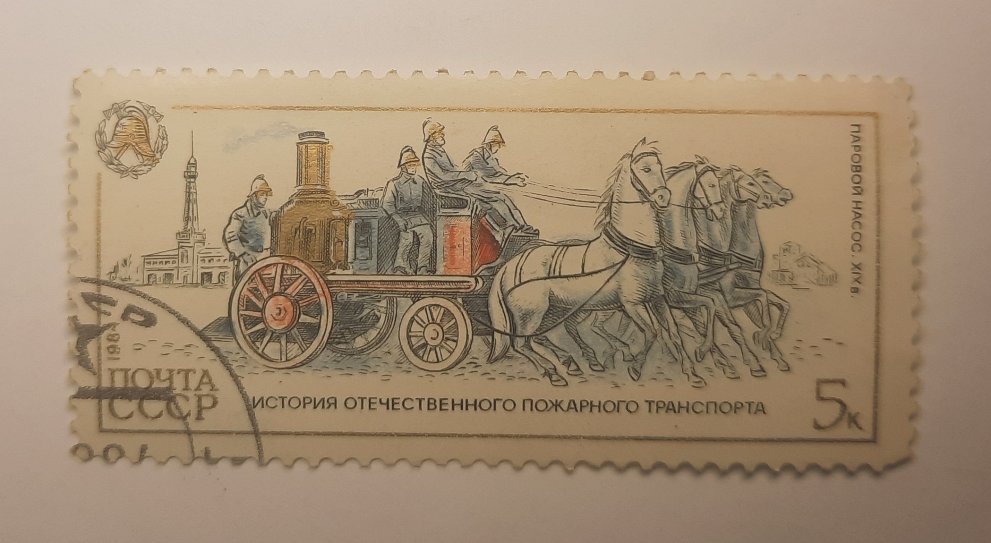 Pe marca poștală este reprezentată o imagine cu o căruță cu 4 cai, în căruță sunt 4 persoane, dedesubt, ”ИСТОРИЯ ОТЕЧЕСТВЕННОГО ПОЖАРНОГО ТРАНСПОРТА”. Pe stânga, jos, ”ПОЧТА СССР”, pe verticală anul emiterii, ”1984”, iar pe dreapta, ”5к”. Sus, pe dreapta, pe verticală, ”ПАРОВОЙ НАСОС. ХIХв.