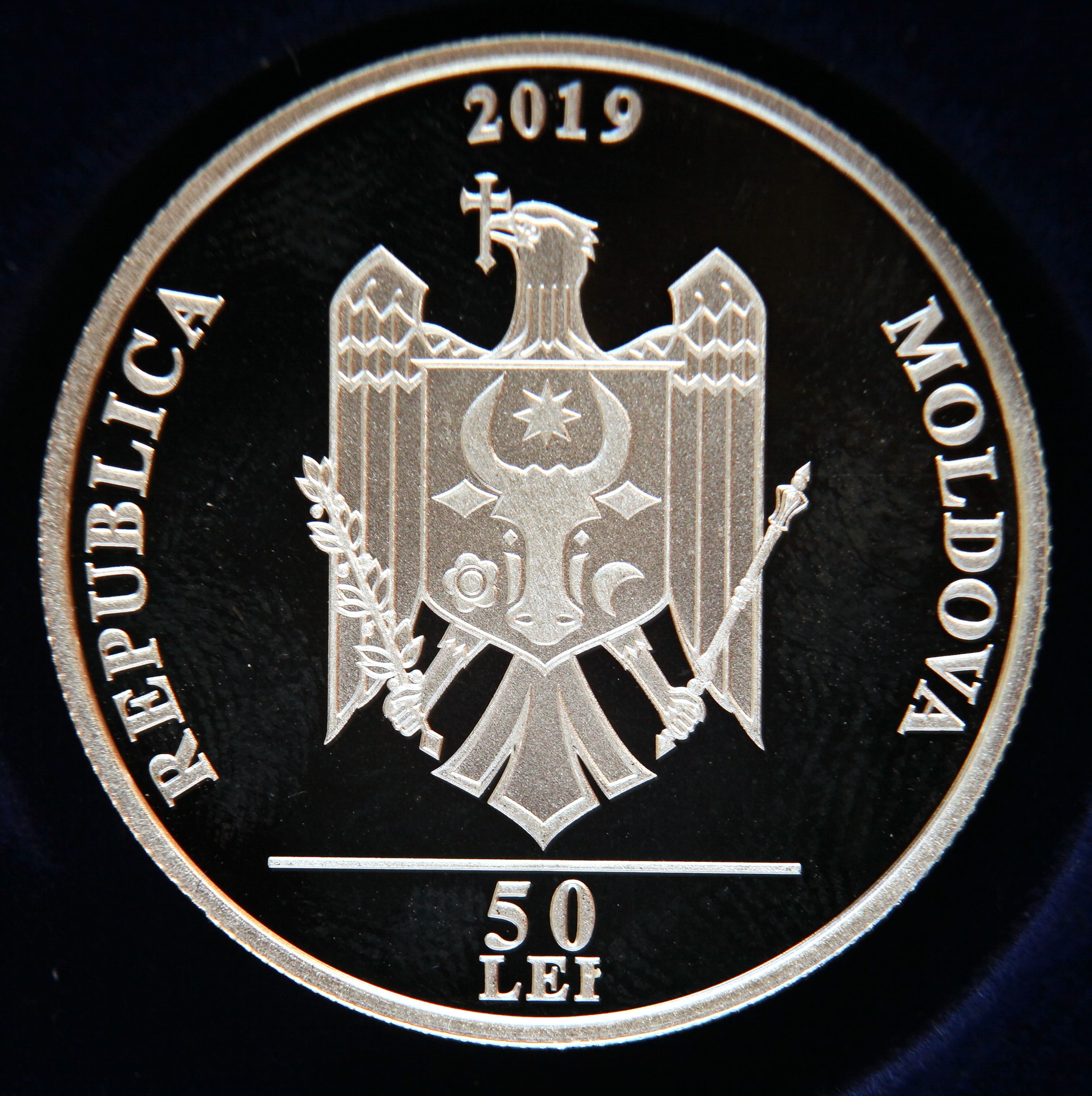 Revers: centru - o stemă cu vultur, jos - nominal 50 lei, sus - 2019, marginile Republica Moldova.