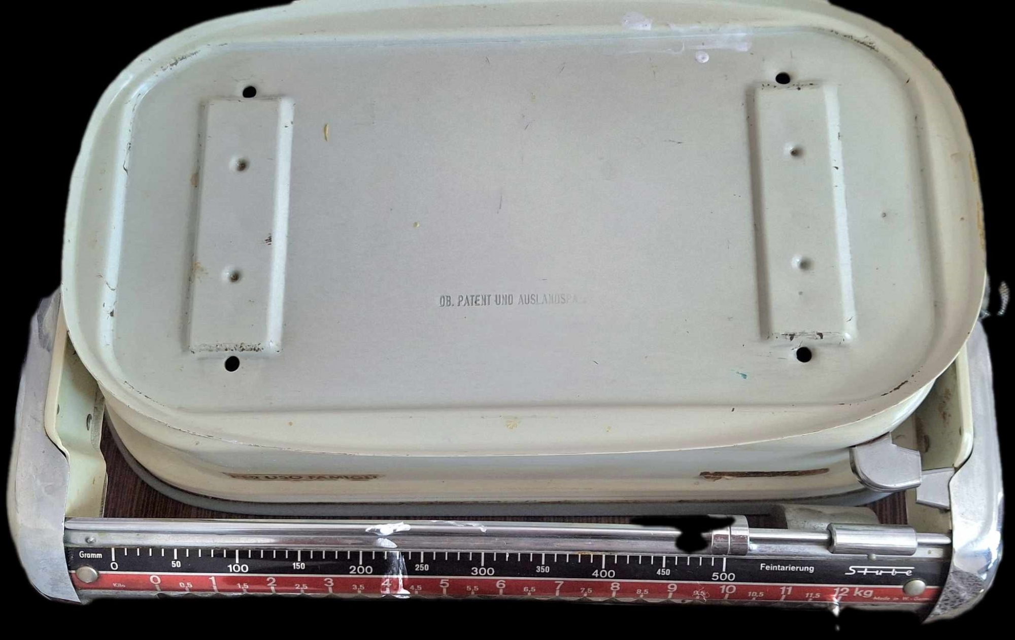 Cântar mecanic cu scală gradată, funcționează pe baza balansierului.. Scala este împărțită în două, în partea de sus ,în grame ( până la 500g), în partea de jos, în kg, capacitate maxima 12 kg. Corpul cântarului este din metal vopsit în bej. În partea dreaptă scrie ,, Feintarierung …Made in W.- Germany,,. Aparține mărcii Stube. Inscriepție adițională ,, DB. Patent and Auslandspatentt,, .