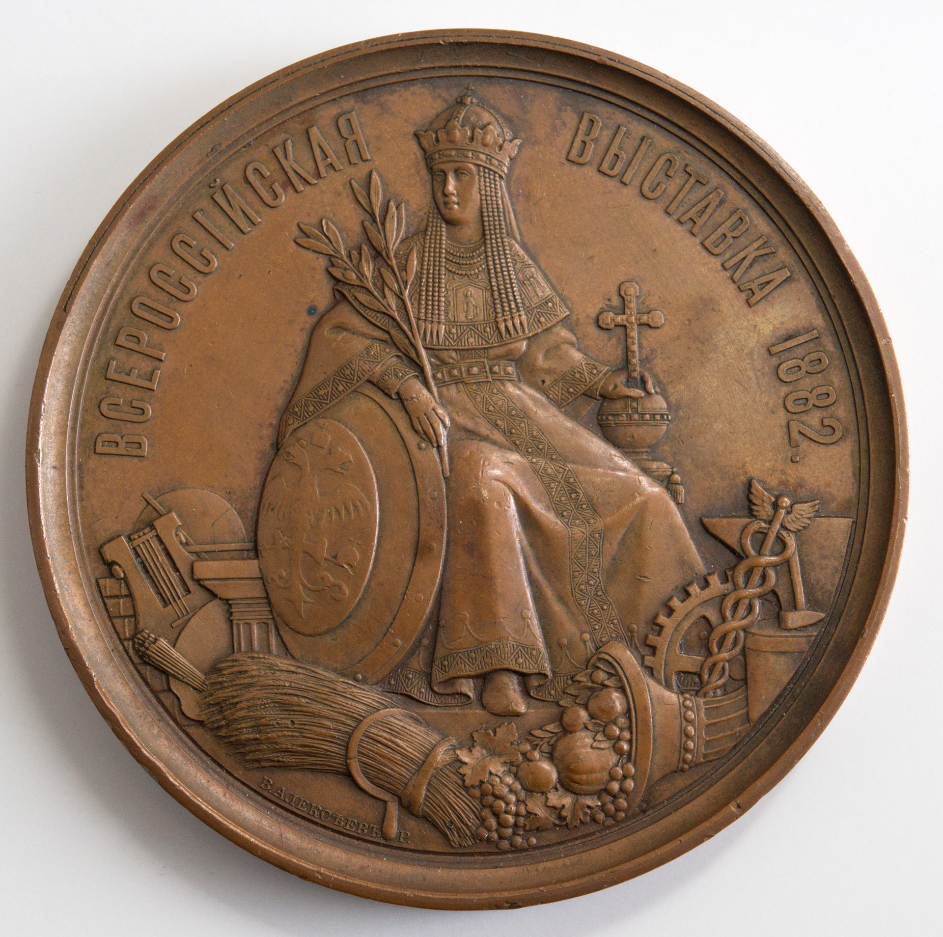 Revers: o femeie, simbolizînd Rusia, aşezată; la picioarele ei sunt produse agricole, industriale şi artistice. Compoziţia reprezintă expoziţia din 1882. jos: numele meşterului. Sus margine: legenda - "expoziţia Imperiului Rus din 1882" (în rusă).