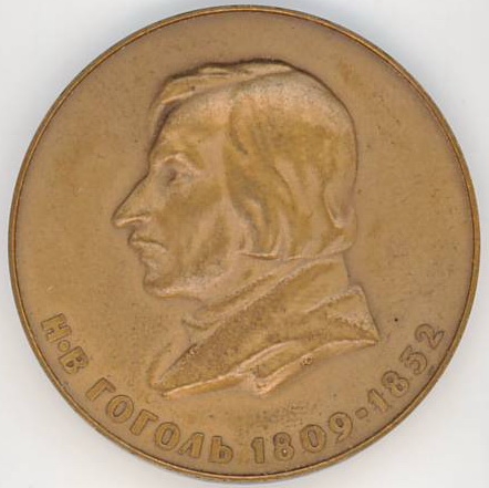 rotundă cu muchie netedă. Avers: efigia lui Gogol în profil stg, margine jos - numele scriitorului și anii de viață. Revers: la centru e un sul desfășurat inscripționat, jos în drp - o pană, în stg - crenguță.