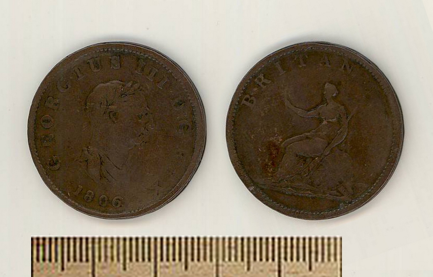 avers: regele redat bust, profil drp, pe cap - cunună de laur. Legenda: Georgius III d g rex 1806. revers: o femeie aşezată, profil stg, poartă tunică, ţine în mîna stg o ramură, în mîna drp - o suliţă, în drp ei - un scut oval. Legenda: Britain. Muchie netedă supraînălţată.