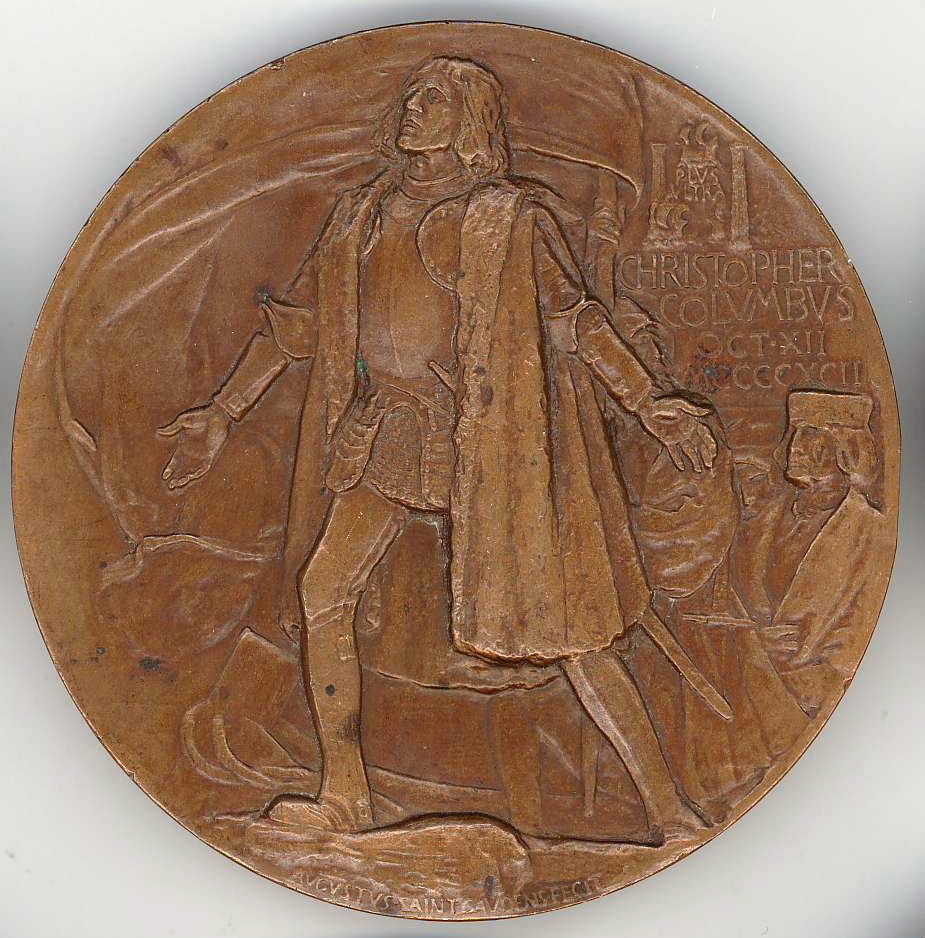 rotundă, cu muchie netedă. Avers, în prim plan, în plină staturăe Cristofor Columb, în plan secund sunt 2 personaje masculine cu drapele, ex-centric spre drp e legenda în 4 rînduri, marginal jos - numele meșterului medalier. Revers: 2 personaje alegorice lîngă un glob, așezate pe un panou inscripționat, flancat de 2 torțe arzînd; jos, pe o apă e o corabie cu pînze ridicate; în exergă e numele meșterului medalier.