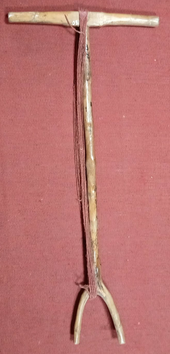 Râșchitoare din lemn, realizată dintr-o ramură cu mâner transversal și bifurcație inferioară. Era folosită pentru întinderea și separarea firelor.