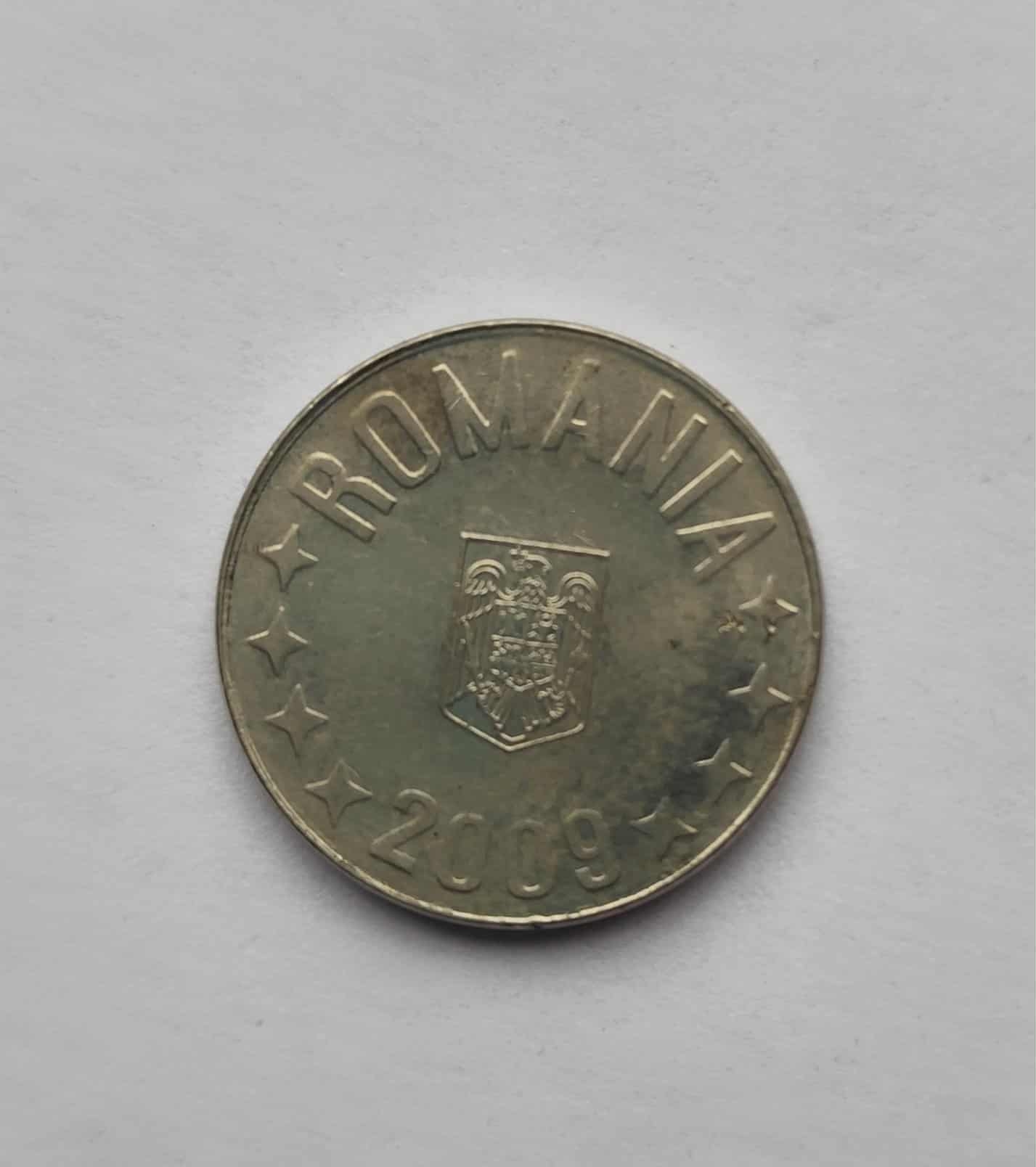 Moneda de formă circulară cu muchia netedă și valoarea nominală de 10 bani din România. Reversul monedei are pe circumferința superioară inscripționat cu majuscule numele țării emitente: ROMANIA. În centru se află Stema României, reprezentând acvila (vulturul) cruciată, având în cioc o cruce și ținând în gheare un sceptru și o spadă. Sub stemă este marcat anul emiterii monedei: 2009. Circumferențial în jurul stemei și a anului sunt distribuite un număr de 12 stele, simbolizând Uniunea Europeană și aspirațiile europene ale României. Pe aversul monedei valoarea nominală în partea superioară este inscripționată cu cifra mare 10.