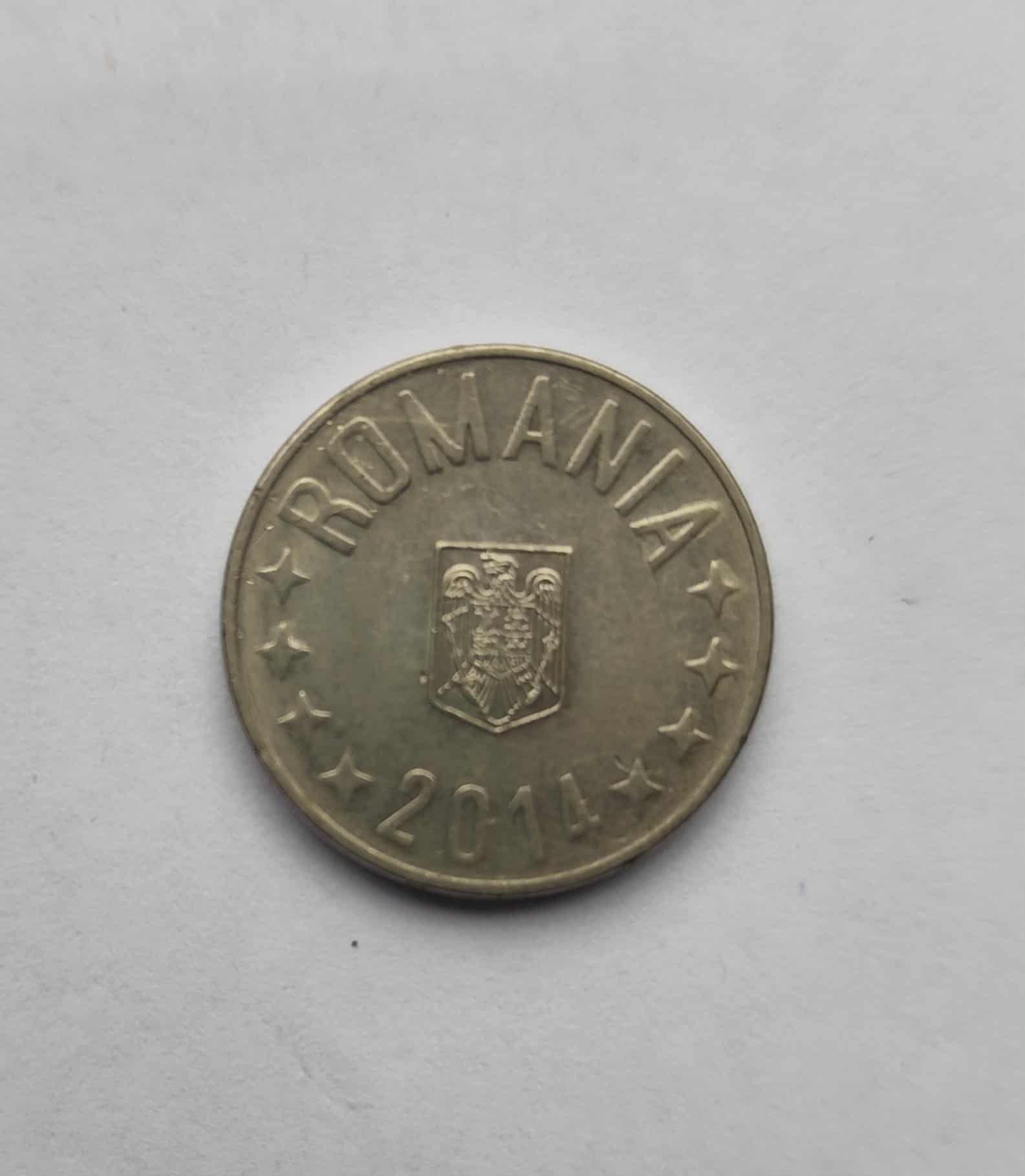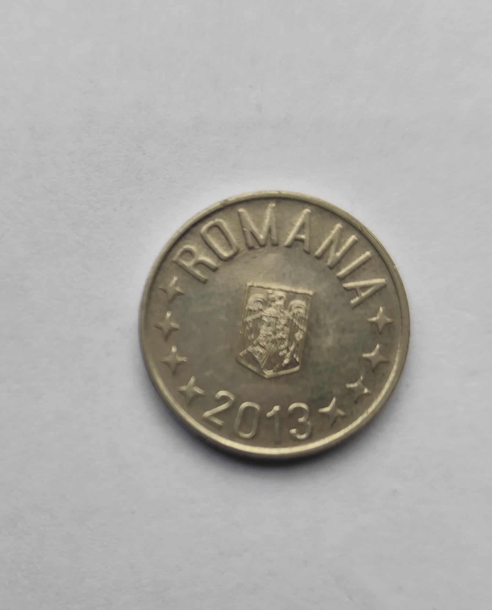 Moneda de formă circulară cu muchia netedă și valoarea nominală de 10 bani din România. Reversul monedei are pe circumferința superioară inscripționat cu majuscule numele țării emitente: ROMANIA. În centru se află Stema României, reprezentând acvila (vulturul) cruciată, având în cioc o cruce și ținând în gheare un sceptru și o spadă. Sub stemă este marcat anul emiterii monedei: 2013,2014. Circumferențial în jurul stemei și a anului sunt distribuite un număr de 12 stele, simbolizând Uniunea Europeană și aspirațiile europene ale României. Pe aversul monedei valoarea nominală în partea superioară este inscripționată cu cifra mare 10.