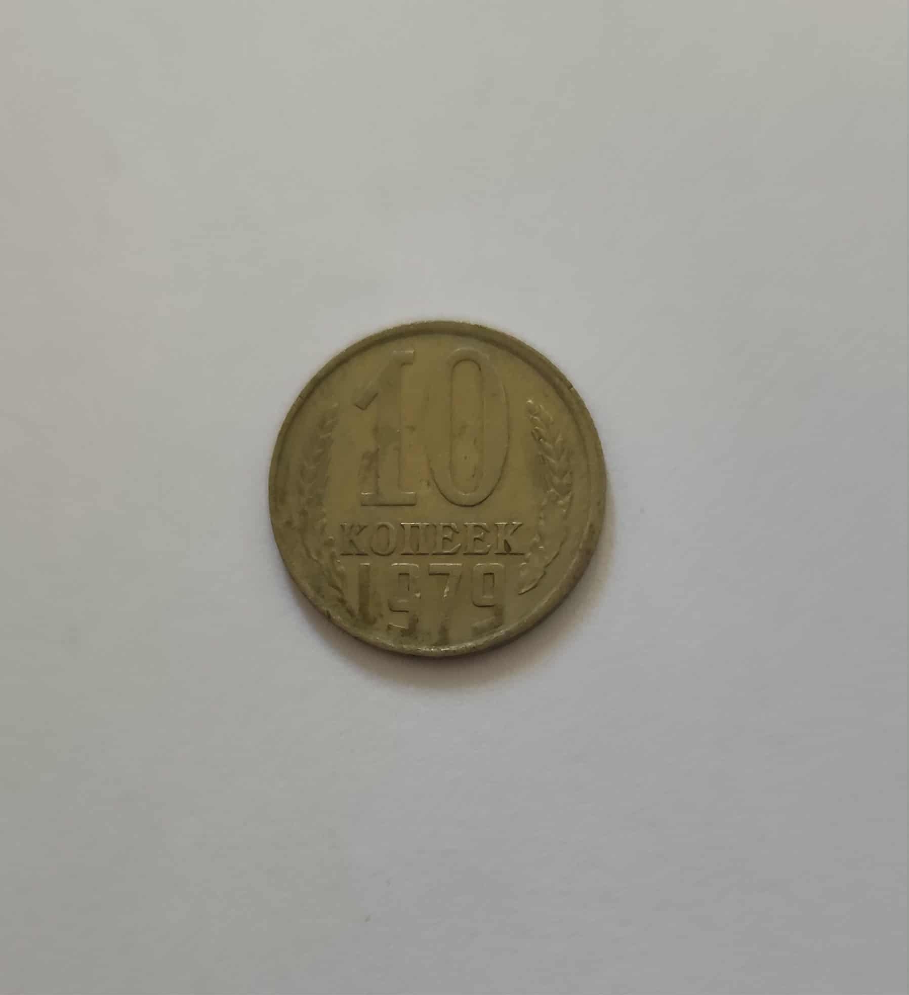 Monedă de formă rotundă care pe revers are stema Uniunii Sovietice, formată dintr-o seceră și un ciocan, simboluri ale unității muncitorilor și țăranilor, așezate pe globul pământesc. În spatele globului se ridică un soare, iar totul este înconjurat de două spice de grâu legate la bază cu o panglică pe care scrie CCCP (abrevierea pentru Uniunea Republicilor Socialiste Sovietice, în rusă). Deasupra stemei se află o stea cu cinci colțuri. Pe aversul monedei sunt inscripționate valoarea nominală 10 , iar sub el scrie КОПЕЕК (Kopeek), care înseamnă copeici. Sub valoare este anul de emisiune: 1979. Toate aceste elemente sunt înconjurate de două spice de grâu.