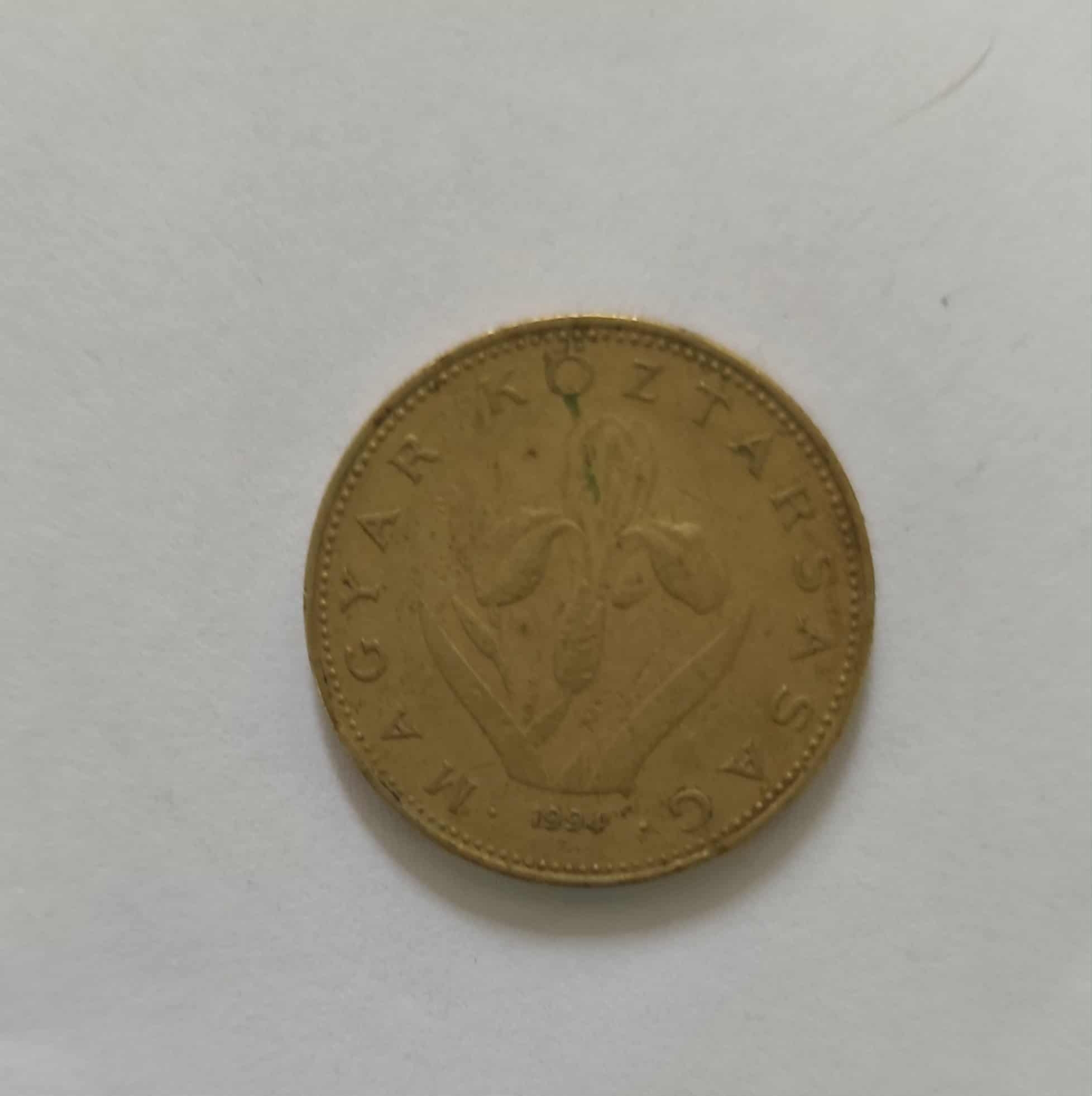 Moneda de formă circulară, cu muchia zimțată, de cculoare galben-aurie/bronzată, și valoarea nominală de 20 Forint din Ungaria. Păe reversul monedei designul central prezintă o reprezentare stilizată a unei flori de Iris, așezată pe un fundal neted. Circular înconjurând floarea, se află inscripția: MAGYAR KÖZTÁRSASÁG (Republica Ungară). Sub floare, lângă marginea de jos, este vizibil anul emiterii: 1994. Pe aversul monedei este valoarea nominală cu cifre mari