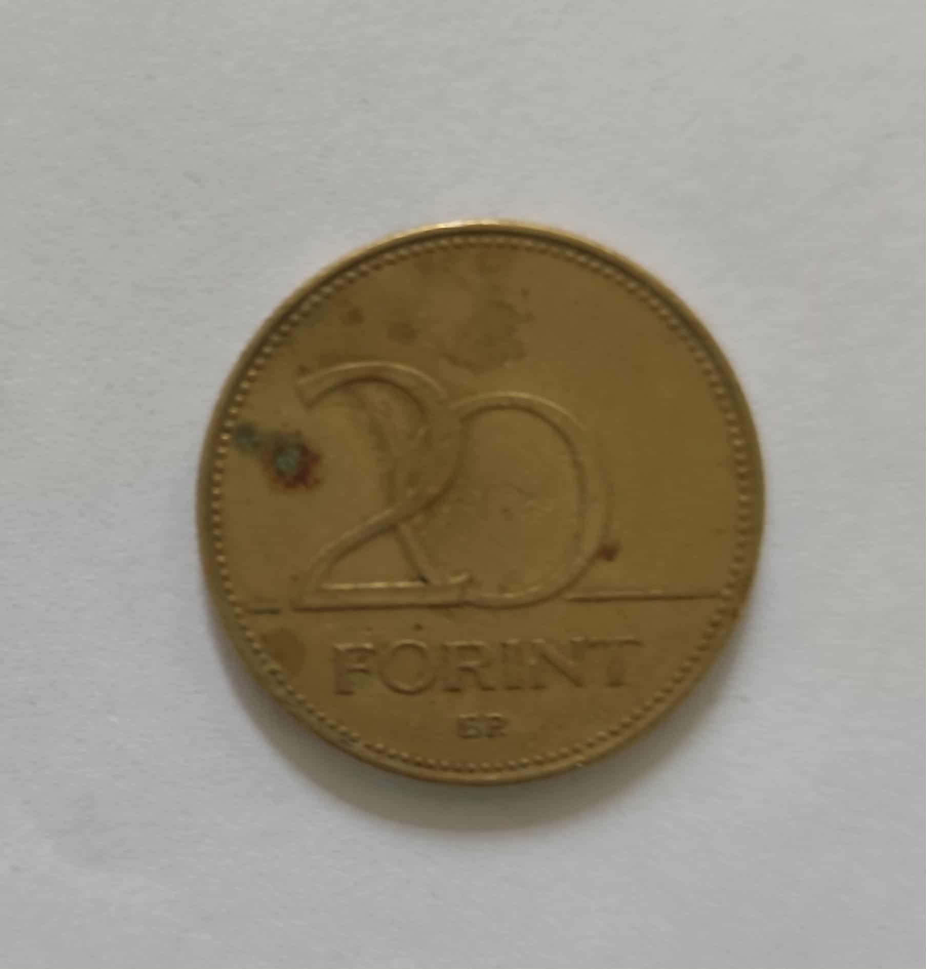 "20" , ce domină partea superioară a aversului. Sub cifră, este inscripționat cuvântul "FORINT", denumirea monedei maghiare. Sub denumirea "FORINT", se observă inscripția "BP" (prescurtare pentru Budapesta), care este marca monetăriei.