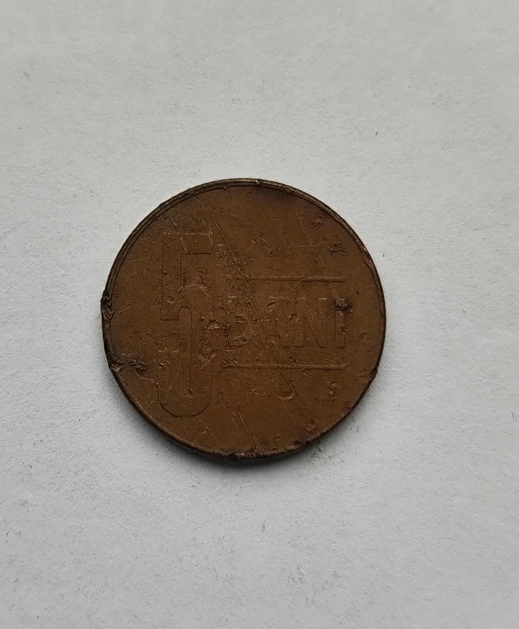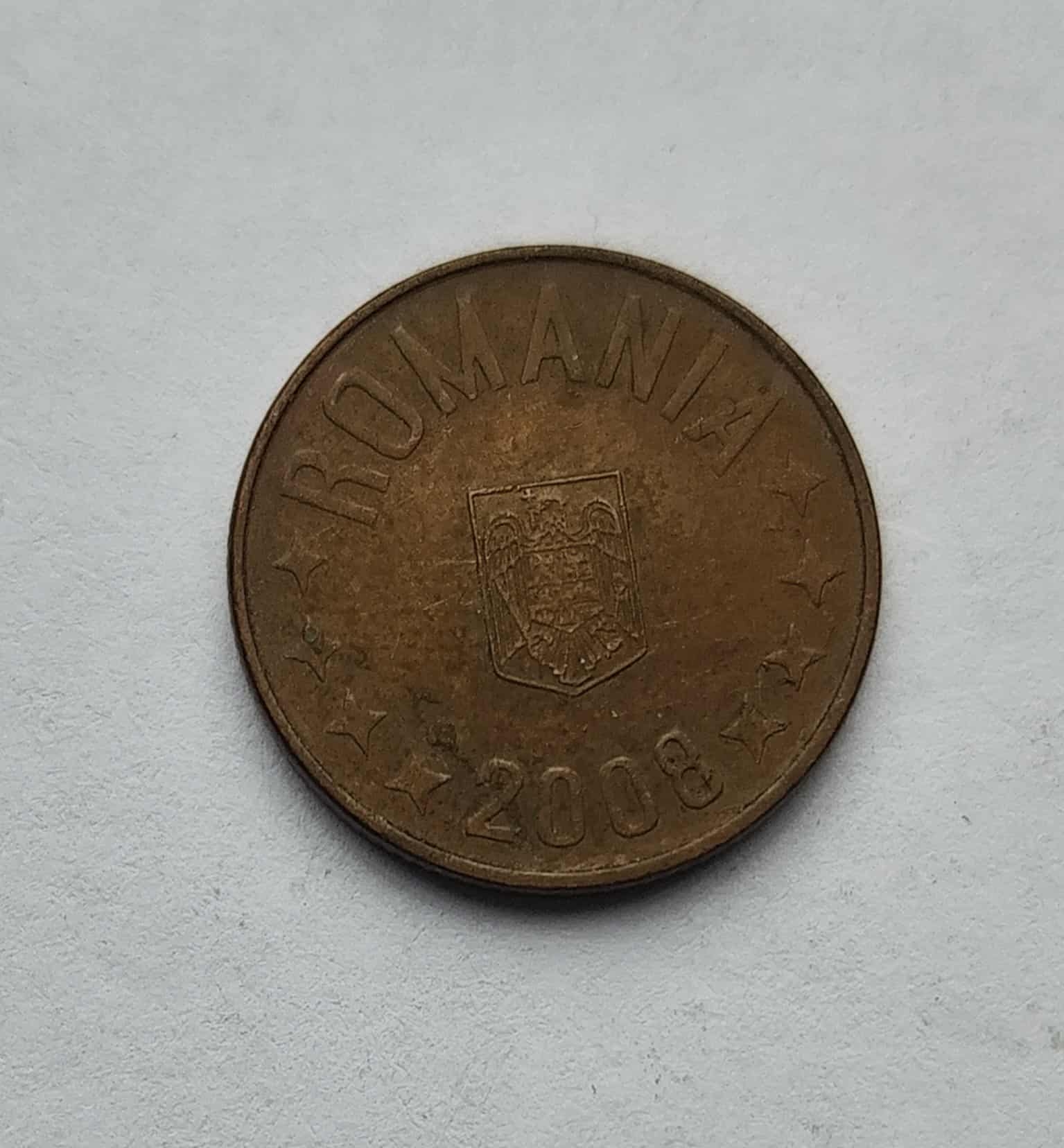Moneda de formă circulară de o culoare arămie/maro și valoarea nominală de 5 bani din România. Pe aversul monedei, valoarea nominală, "5 BANI", este inscripționată clar pe monedă, mare și stilizată, ocupând o mare parte din stânga, iar cuvântul "BANI" este aliniat orizontal în dreapta. Pe reversul monedei, numele țării emitente, "ROMANIA", este inscripționat în partea superioară, urmând circumferința monedei. În centru se află Stema României, un scut cu o acvilă cruciată, încoronată, ținând în cioc o cruce, în gheara dreaptă o spadă și în cea stângă un sceptru, reprezentând însemnele heraldice ale țării, iar sub stemă este inscripționat clar anul emiterii: "2008". În jurul circumferinței (între denumirea țării și anul emiterii) se află un șir de opt stele cu patru colțuri.