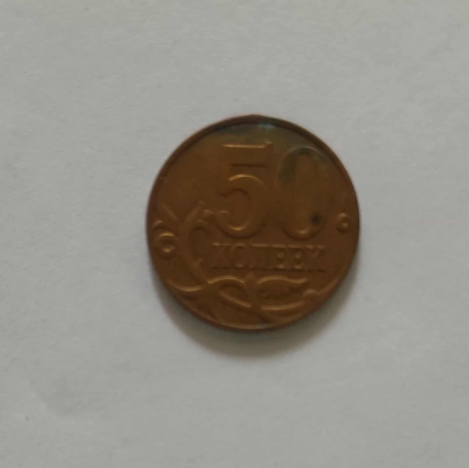 Moneda de formă circulară cu muchia netedă, de o culoare arămie/aurie-roșcată și valoarea nominală de 50 copeici din Rusia. Pe aversul monedei este indicată valoarea nominală cifra mare "50" în partea superioară.