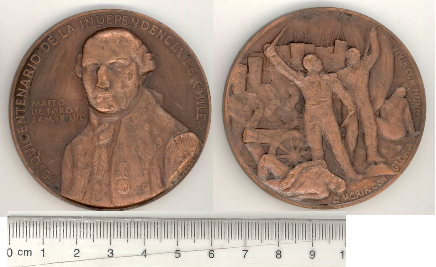 Avers: Mateo de Toro y Zambrano (bărbat, 3/4 stg) în haine militare (redingotă cu guler înalt), la piept - medalie, la gît - batistă. Numele lui gravat. Legendă: sesquicentenario de la independencia de Chile. Revers: scenă de luptă (2 ostaşi cu săbii, lîngă ei - un decedat, tun etc.)