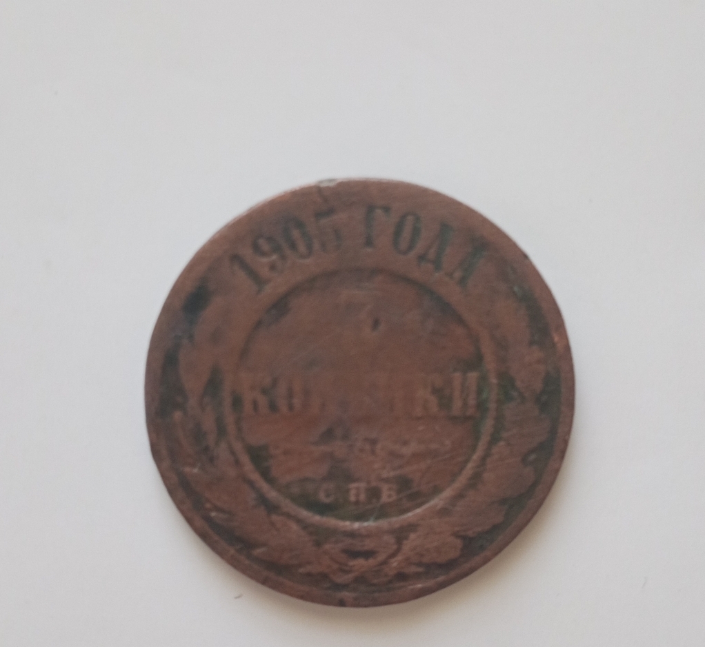 Monedă cu nominalul de 2 copeici (2 копeйки). Perioada de batere: Nicolae al II-lea (1894–1917). Monetărie: Sankt Petersburg. Avers: pe circumferință, sus inscripția [МEДНАЯ РОССИЙСКАЯ МОНЕТА] (MONEDĂ RUSĂ DE CUPRU), în partea de jos a circumferinței, nominalul [ДВЕ/КОПЕЙКИ] (două copeici)”, în mijloc este emblema de stat a Imperiului Rus. Revers: în centru inscripția în două rânduri [2 /КОПЕЙКИ] (2 copeici), dedesubt denumirea monetăriei [СПБ] (Sankt Petersburg), pe circumferință, sus anul emiterii [1905], în stânga - o creangă de laur, în dreapta - de stejar, în partea de jos ramurile sunt legate cu o panglică. Marginea monedei cu nervuri.