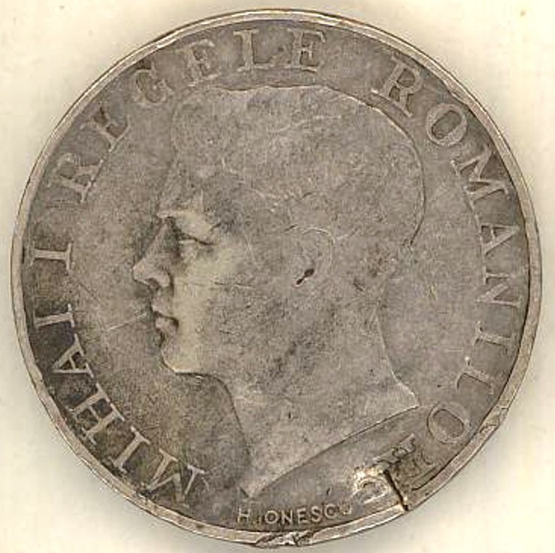 rotundă cu muchie netedă, inscripţionată. Avers: capul regelui Mihai în profil stg, în jurul valorii - inscripţii, jos - numele meşterului medalier. Revers: valoarea nominală, stema României şi anul emiterii; marginal - struguri şi spice de grîu.