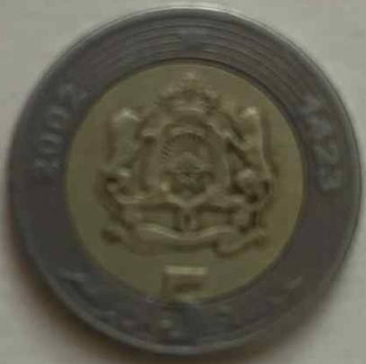 AV:În centru portretul regelui Morocco - Mohamed VI . RV - Legenda circulară dispusă în cinci rânduri . Prin părți: 2002,1423, în centru stema Marocco; jos nominalul - 5. Muchia zimțată. Monetă bimetalică, centru din cupru, părțile laterale (în cerc) din alamă.
