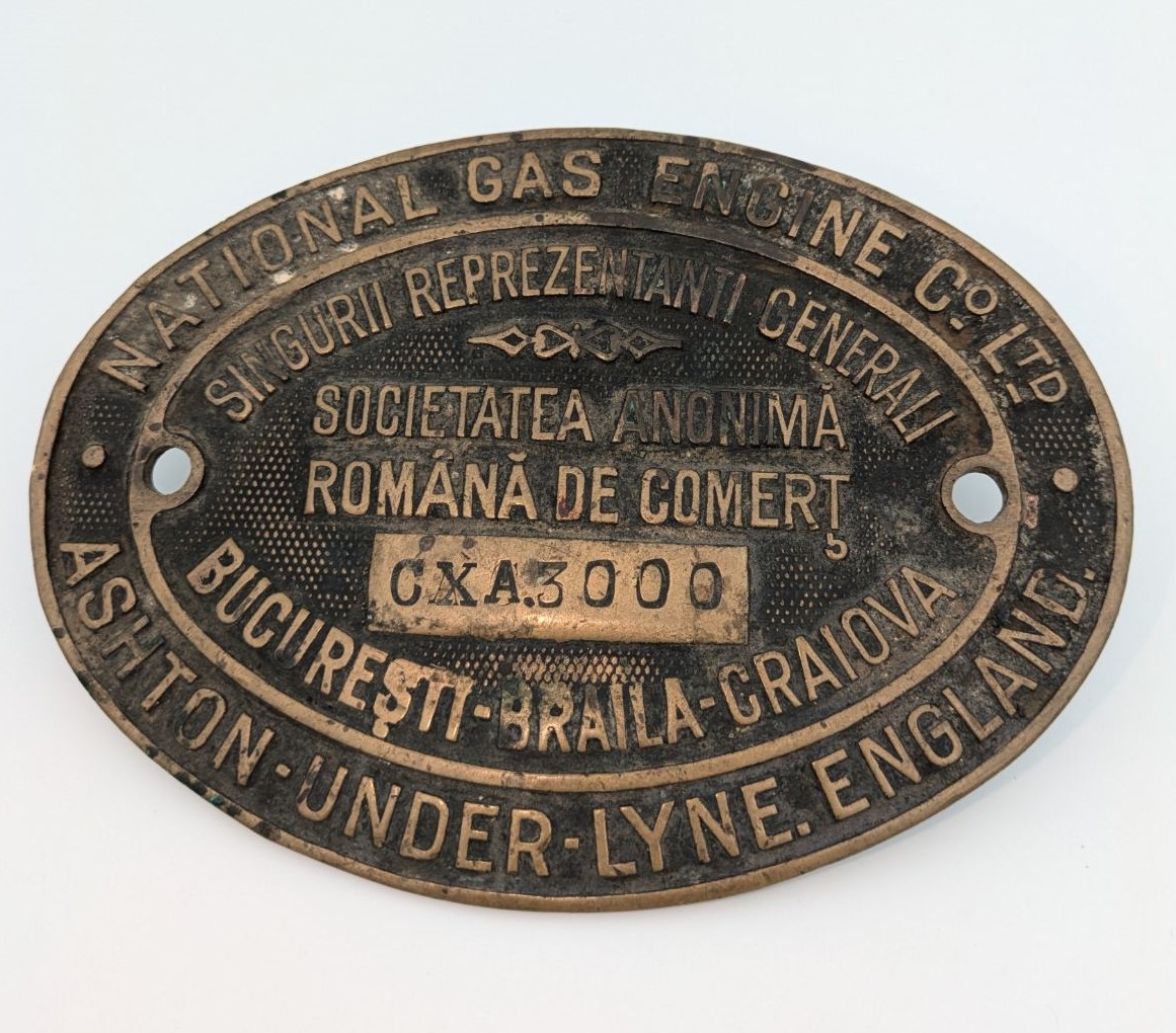 Piesa de formă ovală din alamă, este o plăcă de identificare (de fabrică) a unui producător englez de motoare cu o reprezentare internațională. De-a lungul circumferinței există inscripții: în partea de sus [NATIONAL/GAS/ENGINE/CO./LTD] – numele producătorului; jos - [ASHTON-UNDER-LYNE. ENGLAND.] — localitatea, indică originea autentică. Inscripția pe centru în română: [SINGURII/REPREZENTANȚI/GENERALI / SOCIETATEA/ANONIMĂ/ROMÂNĂ/DE/COMERȚ], cu numele orașelor - [BUCUREȘTI, BRĂILA, CRAIOVA]— indică sediile de reprezentare ale companiei în România. Numărul indicat [CXA3000] poate fi numărul de serie sau de model al dispozitivului (motorului/unității).