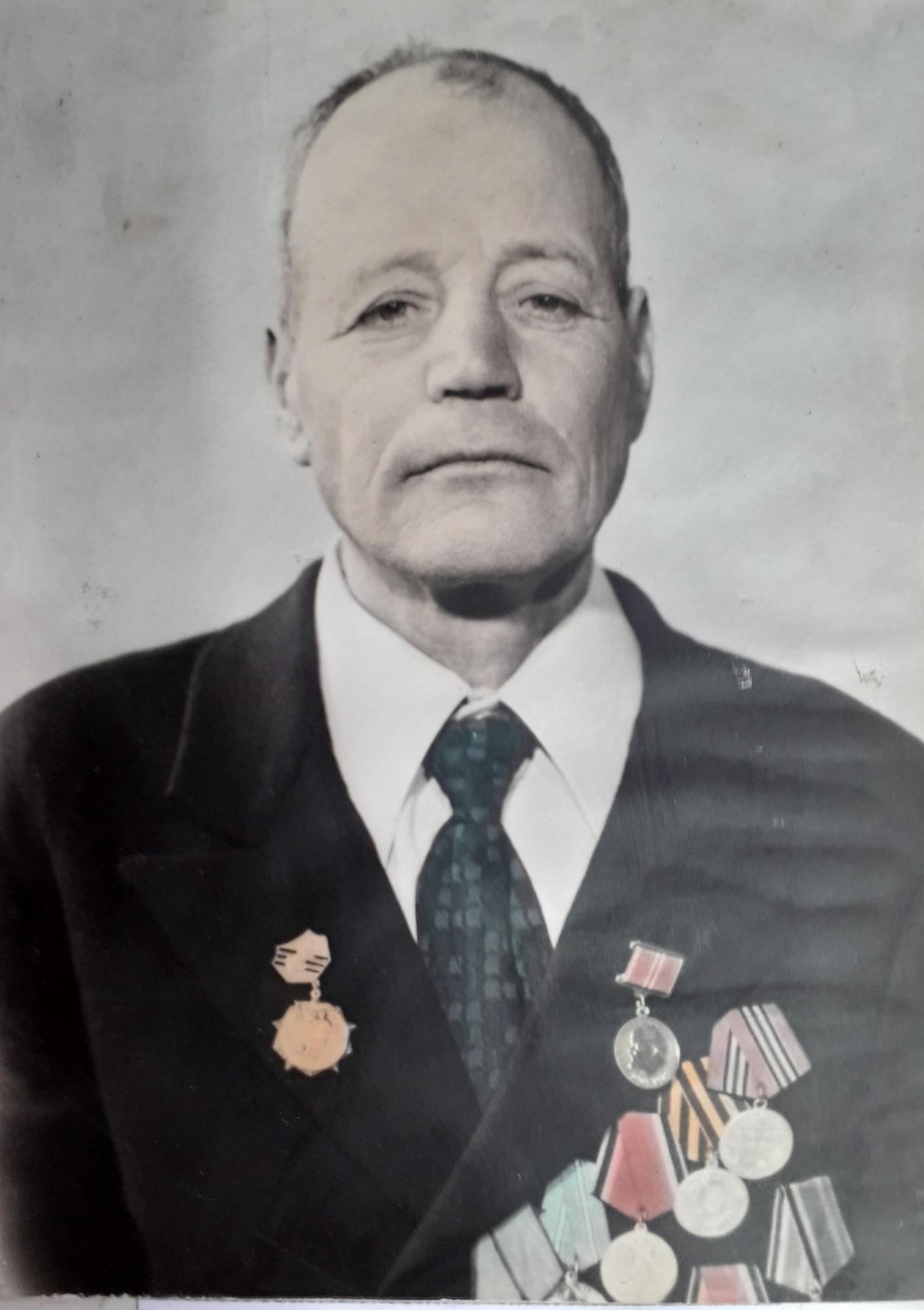 Fotografie portret- Secrieru Iacob,veteran al Celui de al Doilea Război Mondial;reprezentat până la piept;privirea ațintită spre obiectiv;frezură scurtă;îmbrăcat in veston,cămașă albă,cravată de culoare verde închis;purtând la piept nouă medalii.Cromatica:negru,verde,roșu,alb.