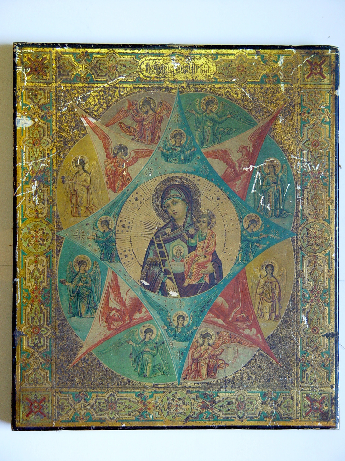 Icoană ce reprezintă: centru - Maica Domnului, bust, în marafion brun-verzui, înscrisă într-un cerc, care formează centrul unei steluţe cu opt colţuri. Fecioara ţine în mîna stîngă o scară; pe braţul drept - Pruncul Iisus. Pe pieptul ei se remarcă chipul unui sfînt. Pe patru colţuri ale stelei (verzi) - cîte un înger în veşmînt verzui. Celelalte colţuri înfăţişează cele patru simboluri ale evangheliştilor: omul, viţelul, leul, vulturul. Printre colţuri - îngeri în veşminte aurii, verzi, roşii. Sus inscripţii în slavonă.
