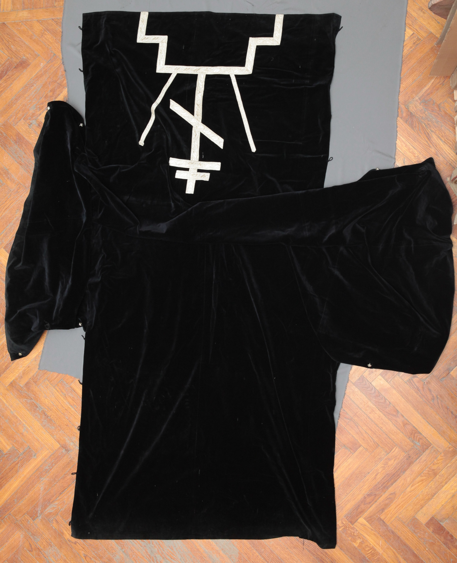 Piesă de forma unei cruci cu 4 braţe; jos e o aplicaţie pe un postament (cruce cu 8 braţe şi Uneltele Patimilor). Pe 2 laturi sunt plasaţi 10 nasturi metalici, pe alte 2 - 10 cheutori. Căptuşeala din bumbac e cafenie. Cromatica: negru, alb, cafeniu.