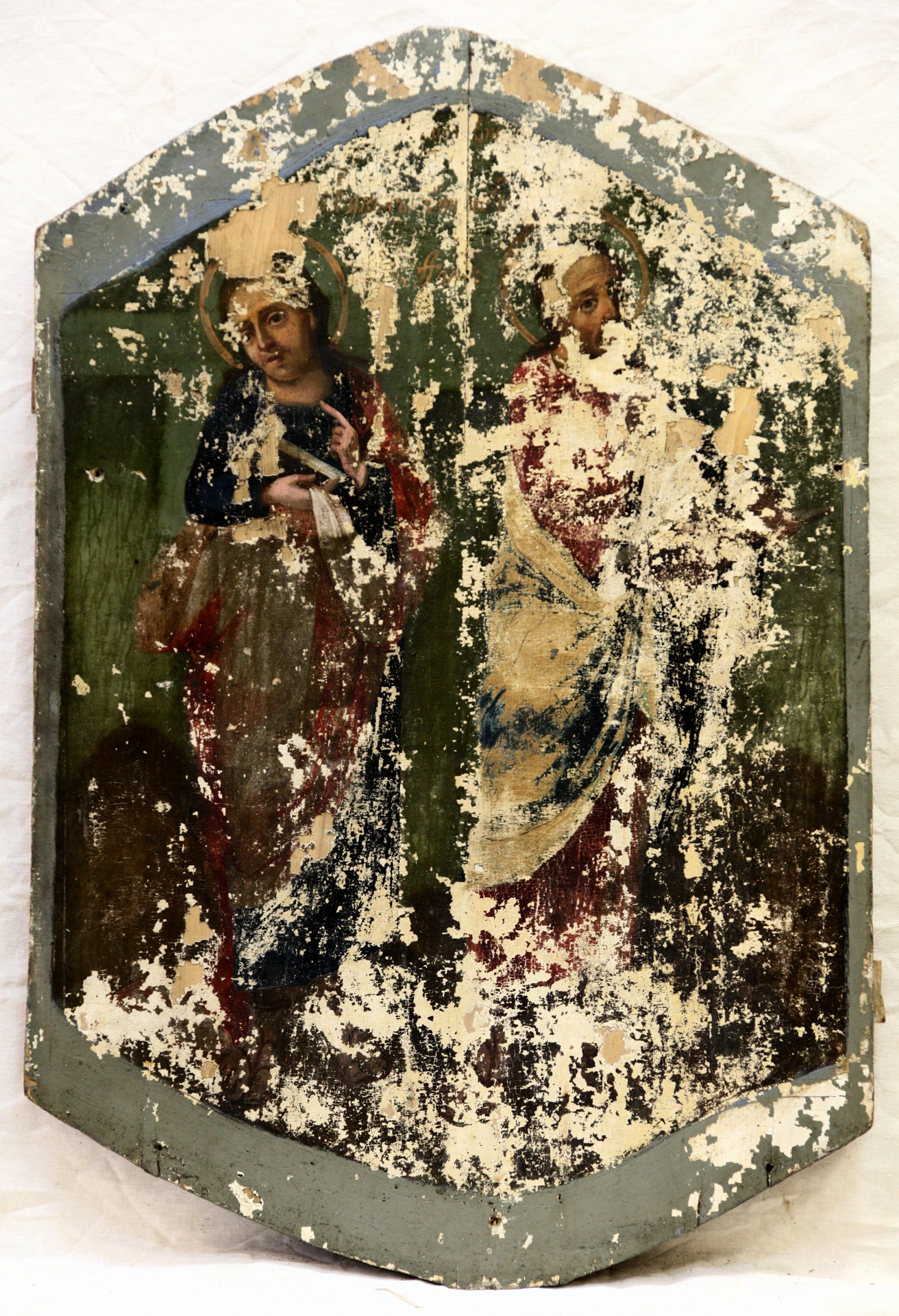 ambii în statură. Poartă veşminte de epocă. Unul din ei ţine în mînă o carte închisă. Nimburi ocru. Fondal verde, jos - cafeniu. Gama: verde, oliv, roşu, ocru. Provenienţa: bis. "Sf. Nicolae".