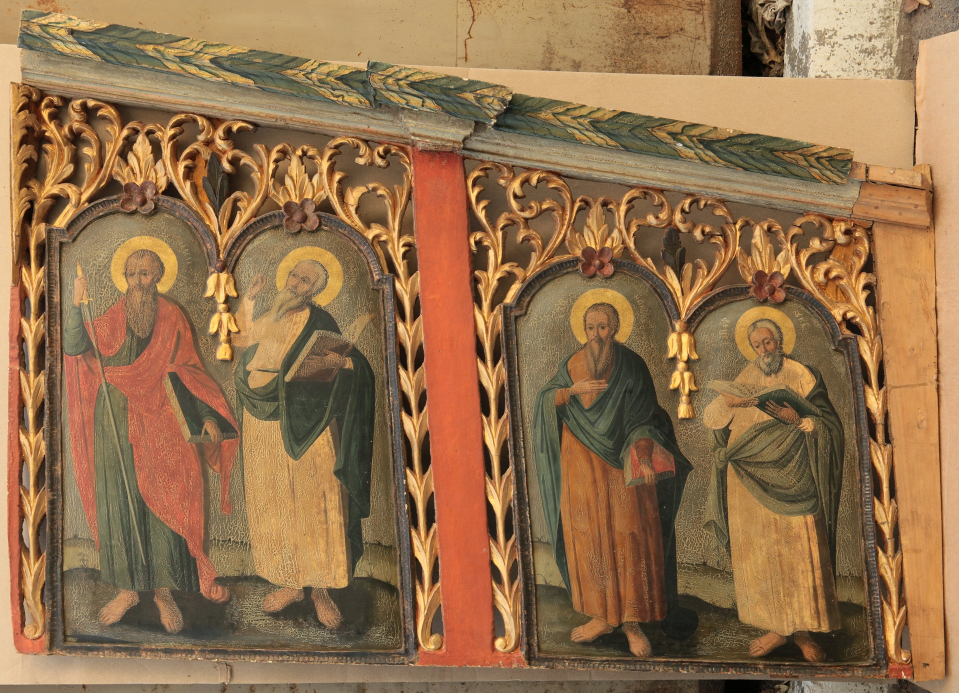 Icoană diptic. În fiecare registru - cîte 2 apostoli, încadrate în semiovale, înconjurate de relief ajurat, aurit. Registrul din stg: Pavel cu evanghelia în mîna stg şi spada în cea drp. Ioan cu evanghelia deschisă. Registrul din drp: Apostolul Iacov cu evanghelia în mîna stg, Luca ţine cu ambele mîini evanghelia deschisă. Gama: roşu, verde, alb, ocru, gri, auriu.