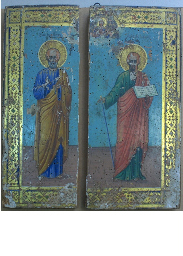 ambii în picioare, pe fondal albastru. Petru ţine în mînă o cheie, poartă veşmînt albastru-ocru. Pavel în chiton verde şi mantie roşie, ţine în mîna drp spada şi în stg - o carte deschisă. Sus centru - Iisus, bust, în miniatură. Marginea icoanei - bogat ornament geometrizat de culoare aurie completat de smalţ multicolor.