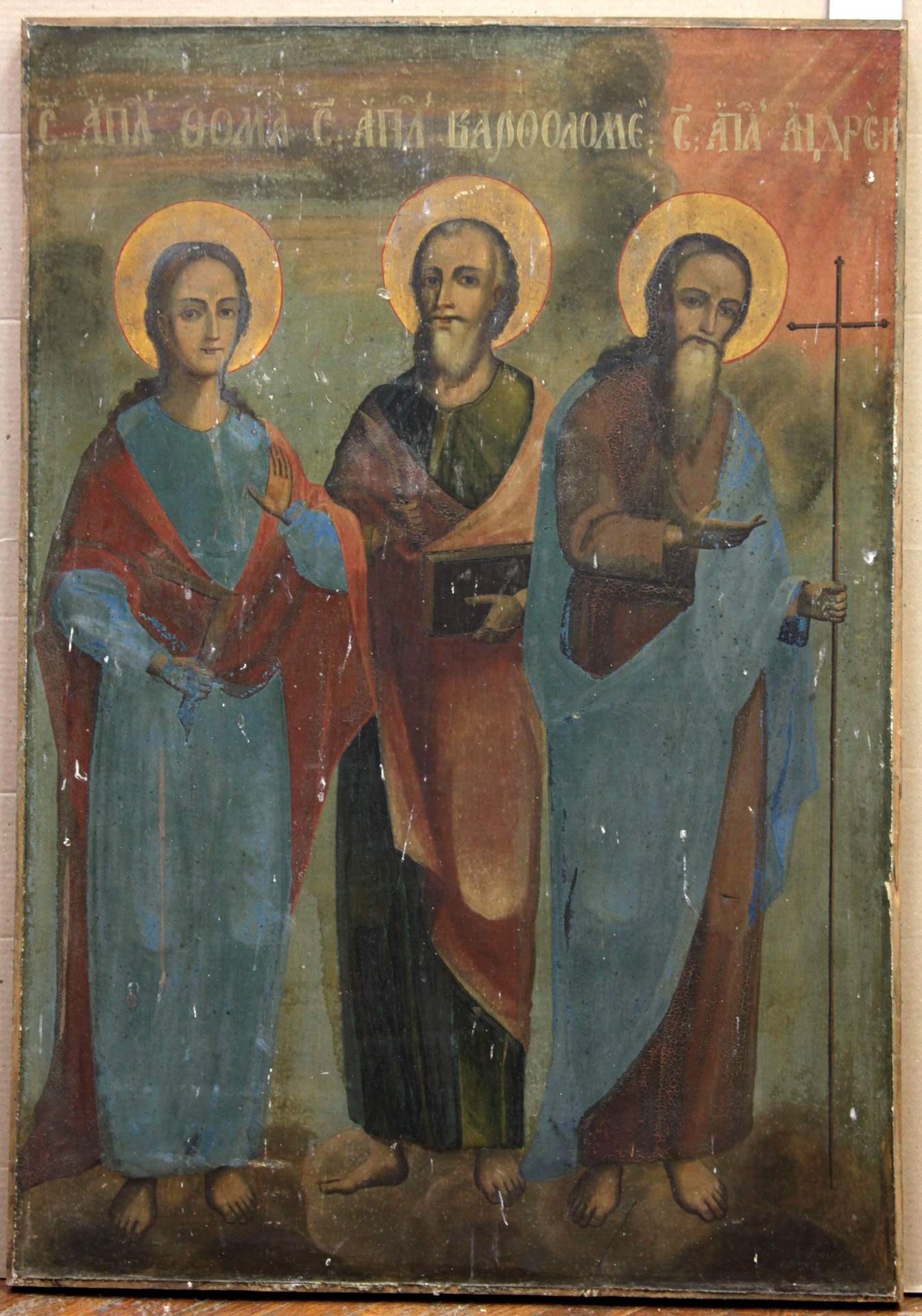3 apostoli în statură: Bartolomeu (centru) în chiton verde şi mantie roşie, ţine în mînă o carte, în alta - o secure; (stg) Toma, mai tînăr, în chiton albastru şi himation roşu, ţine o carte şi Andrei în chiton cafeniu şi himation albastru, ţine o cruce în mînă.