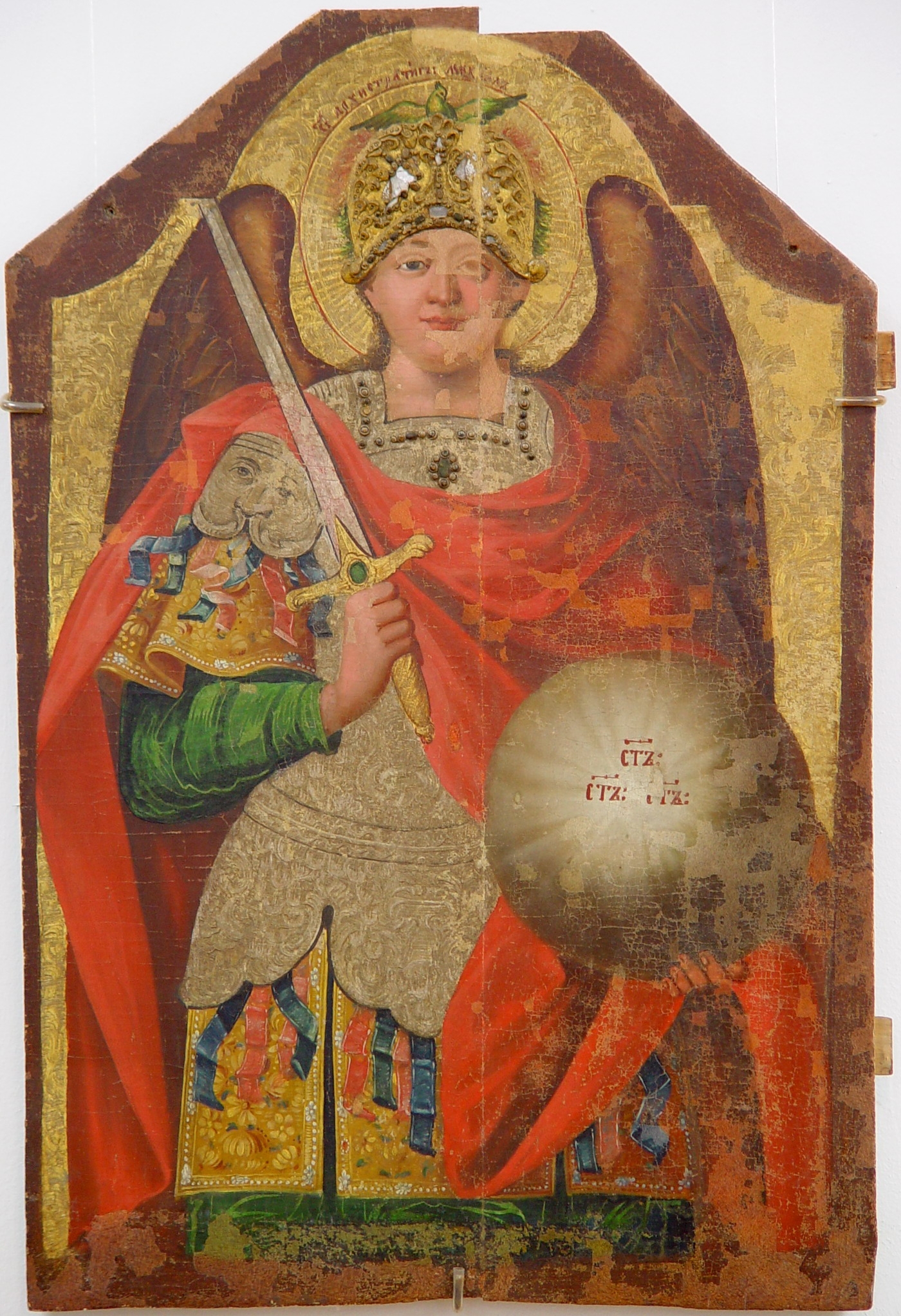 Arhistratigul Mihail pînă la genunchi. Poartă haine de ostaş roman (pe umeri - hlamidă roşie), în mîna drp - spada, în stg - Globul Puterii. Pe cap - coif cu ornament reliefat. La spate - aripi. Pe nimb - porumbel. Gama: roşu, ocru, albastru, brun, verde, gri.