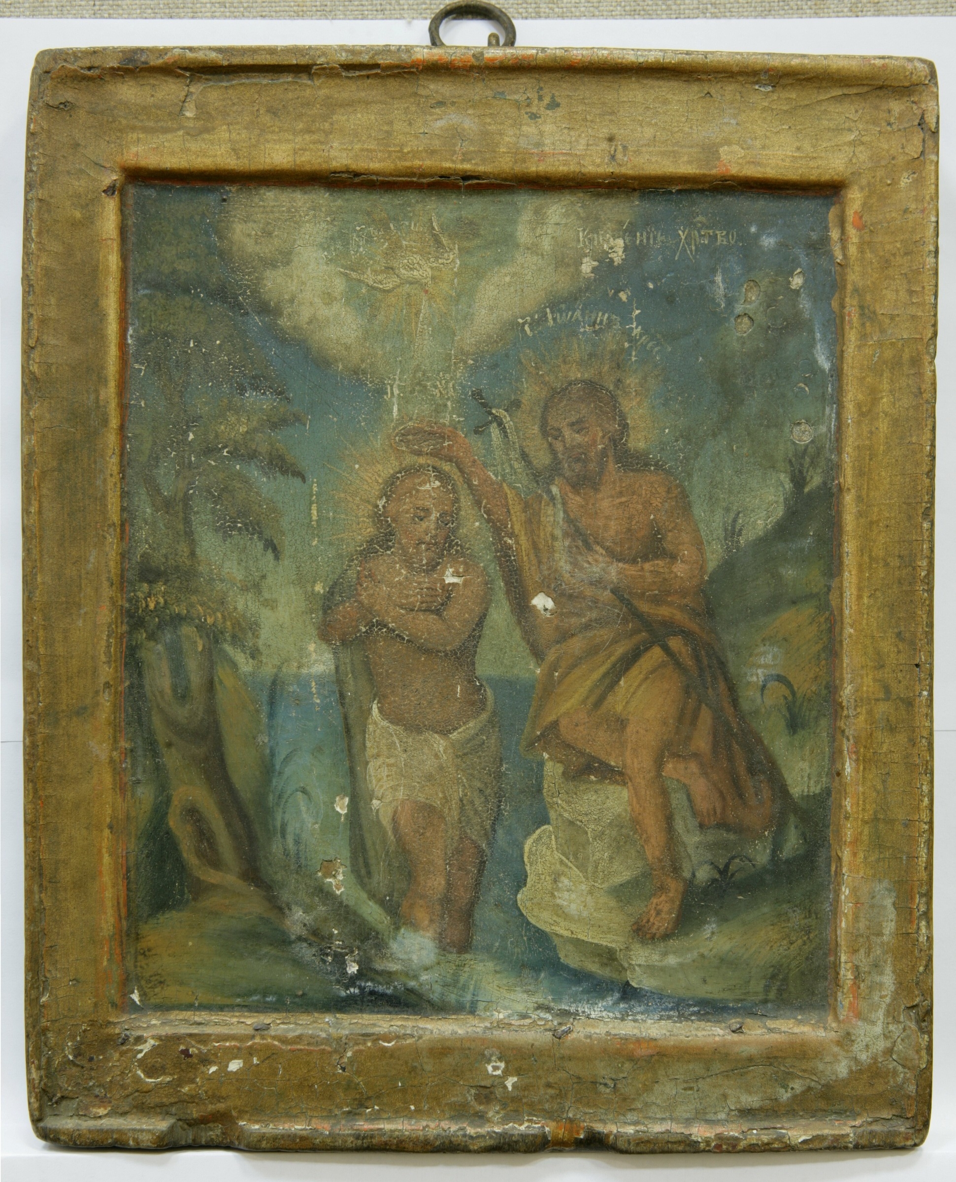 Centru: Hristos în plină statură în apele unui rîu. Ţine mînile încrucişate la piept. Alături, drp: Ioan Botezătoul ţine într-o mînă crucea, cu cealaltă-l binecuvîntează pe Iisus. Sus, centru, pe cer: Duhul Sfînt în chip de porumbel. Fondal de peisaj.