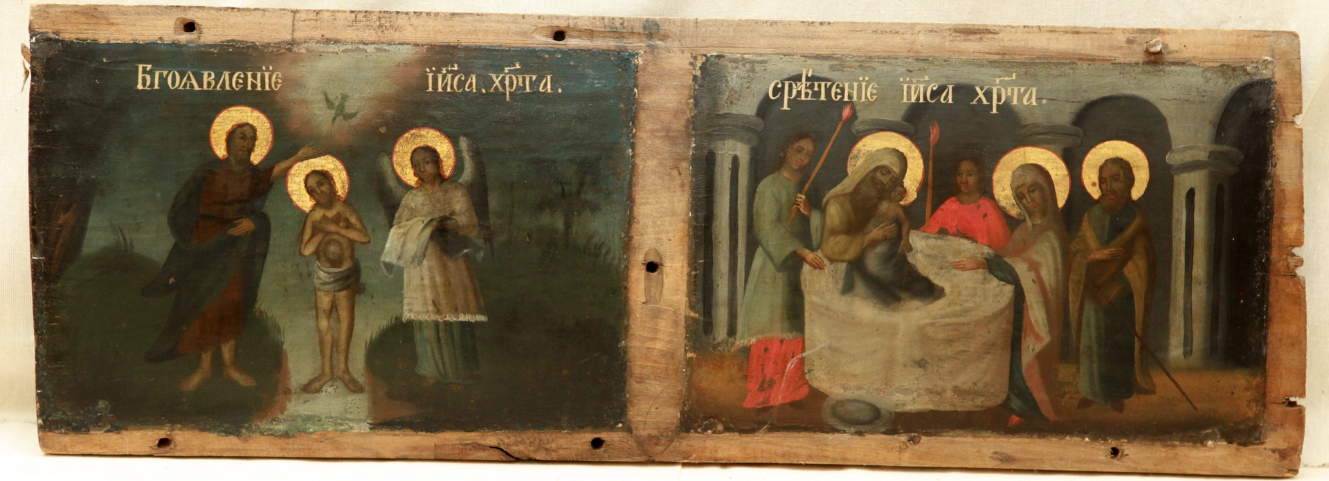 Icoană diptic: (stg) scena "Botezul Domnului" (Iisus - centru în apele Iordanului, flancat de Ioan Botezătorul (stg) şi un Înger (drp); toţ - în statură, sus - Duhul Sfînt în chip de Porumbel), (drp) "Întîmpinarea Domnului" (preotul Simeon ţine în braţe Pruncul Iisus, flancaţi de 2 tineri; alături (drp) Dreptul Iosif şi Fecioara Maria). Gama cromatică: verde, albastru, roşu, ocru, auriu, alb.