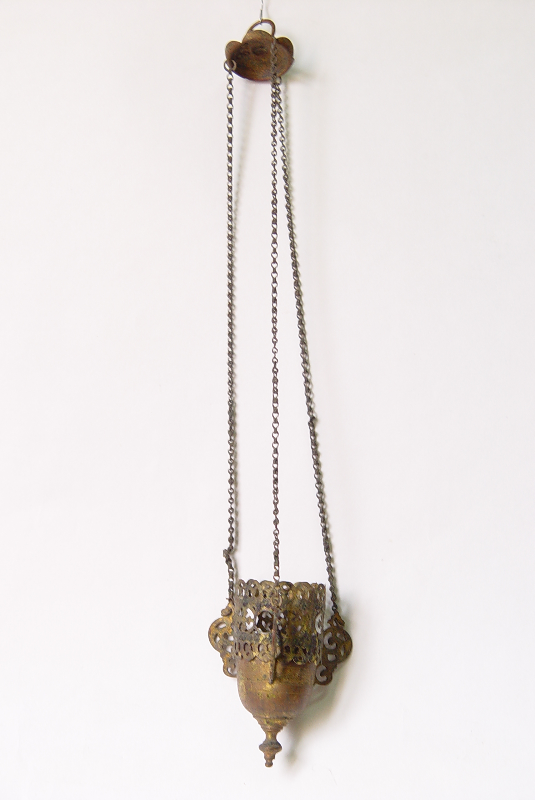 de formă tronconică, îmbrăcată în trafor cu decor geometric, ajurat, format din 3 segmente: sus - brîu din cercuri, semicercuri şi cruci, centru - brîu traforat şi lucrat plat, valuri şi linii, jos - un picioruş cu inel. De 3 torţi sunt prinse 3 lanţuri fixate în capac, cu marginile sub formă de petale, pe centru - un inel.