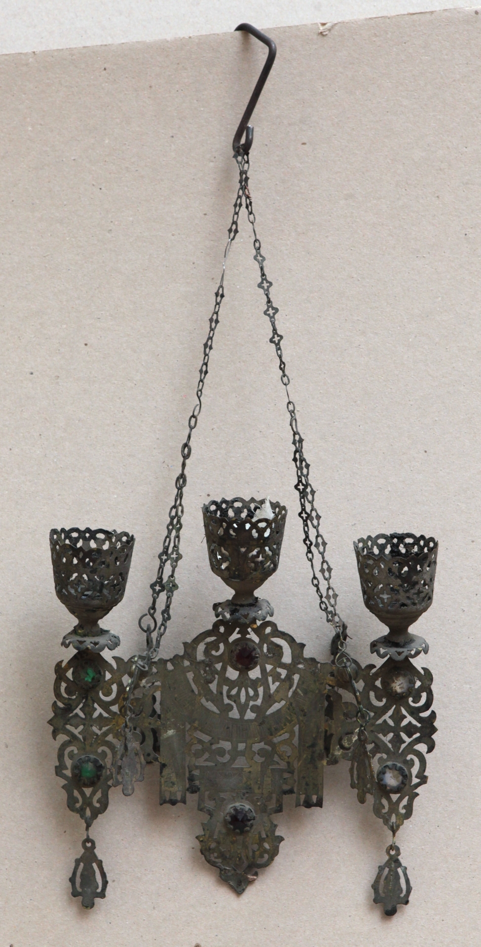 Plachetă cu motive geometrice, vegetale şi de cruce, decorată cu pietre din sticlă verde. Sus - 3 făclii ajurate, cu pălărie şi un lanţ pentru atîrnare.