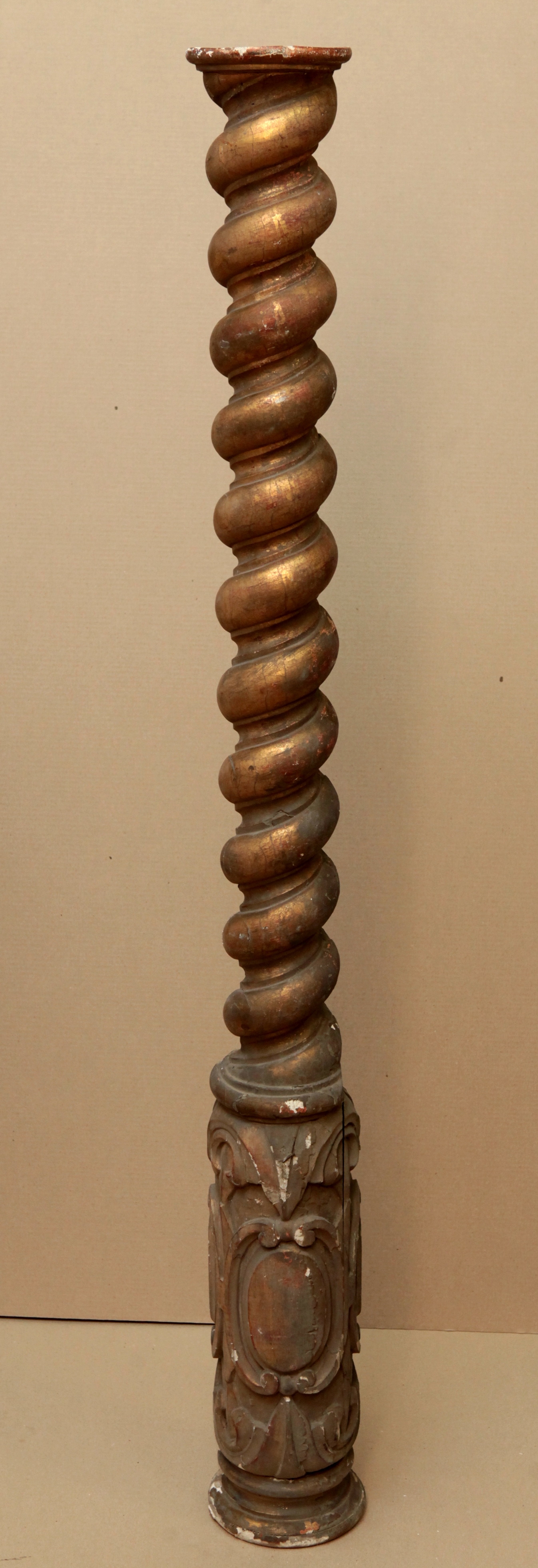 spiroidală, ornată cu o panglică decorativă; partea inferioară e cilindrică cu motive vegetale; bază circulară.