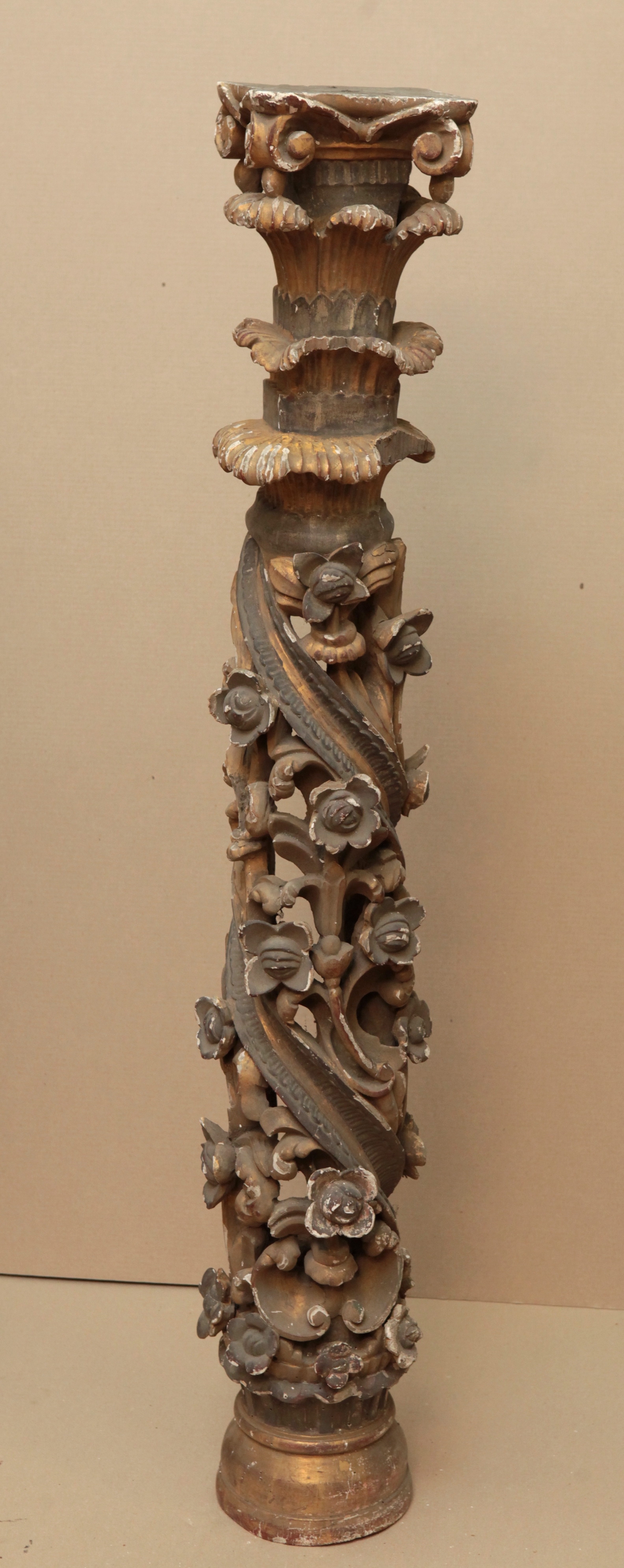 Decor ajurat: motive floral-vegetale, panglică lată pe spirală. Sus - capitelul organizat în registre cu volute şi frunze de acant. Jos - bază circulară.