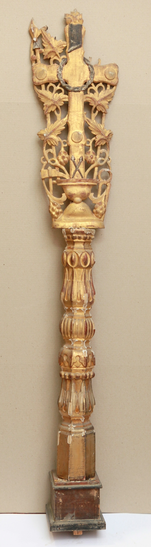 Pe o bază dublă - fus modulat cu ornament vegetal şi geometric. Registrul de sus e sculptat, traforat, motiv - viţă-de-vie. Pe centru - o cruce, coloană din spini, sus - un cui, jos - 2 cuie. Crucea e flancată de suliţă, buretele e pierdut. În registrul de jos - un vas liturgic. În stg - un ciocan, în drp - un cleşte.