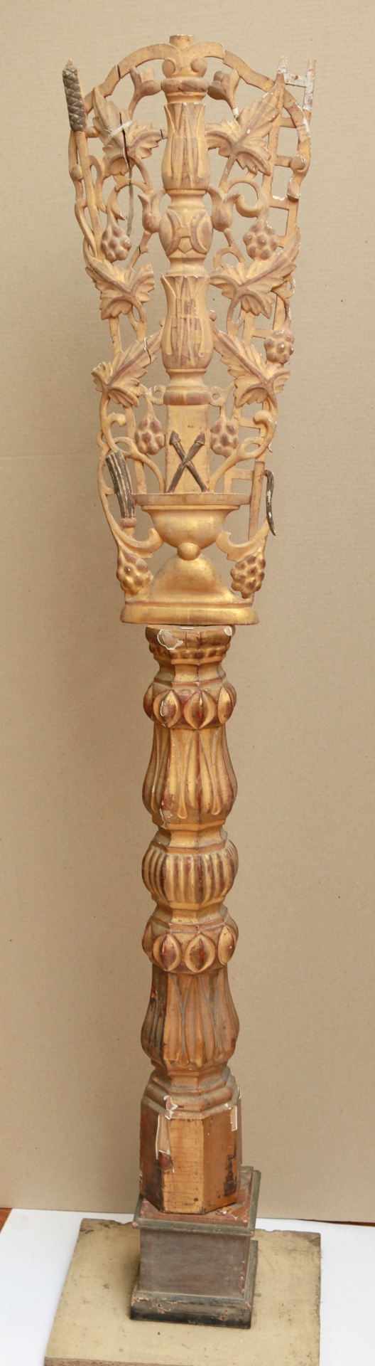 Pe o bază dublă - o coloană cu un fus modulat, ornament vegetal şi geometric. Pe coloană - un vas liturgic. Registrul de sus e sculptat, traforat, motiv - viţă-de-vie. Pe centru - un pilastru doric, jos - 2 cuie încrucişate. Pe stg - suliţa cu burete, iar pe drp - scara.