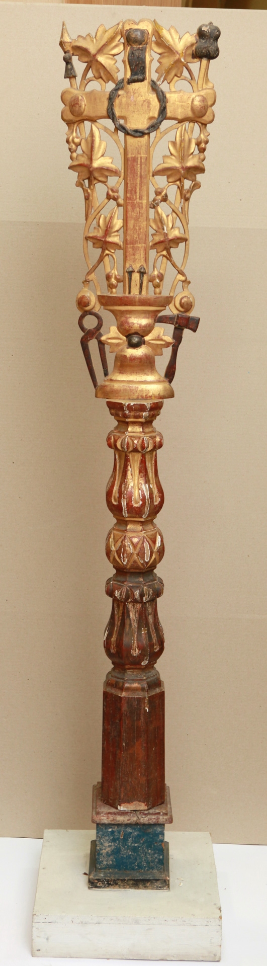 Pe o bază dublă - un fus modulat cu ornament vegetal şi geometric. Registrul de sus e sculptat, traforat, motiv - viţă-de-vie. Pe centru - o cruce cu coroană de spini, un sul sus, jos - 2 cuie. Crucea e flancată de o suliţă şi burete. În registrul de jos - un vas liturgic, pe stg - un cleşte, pe drp - un ciocan.