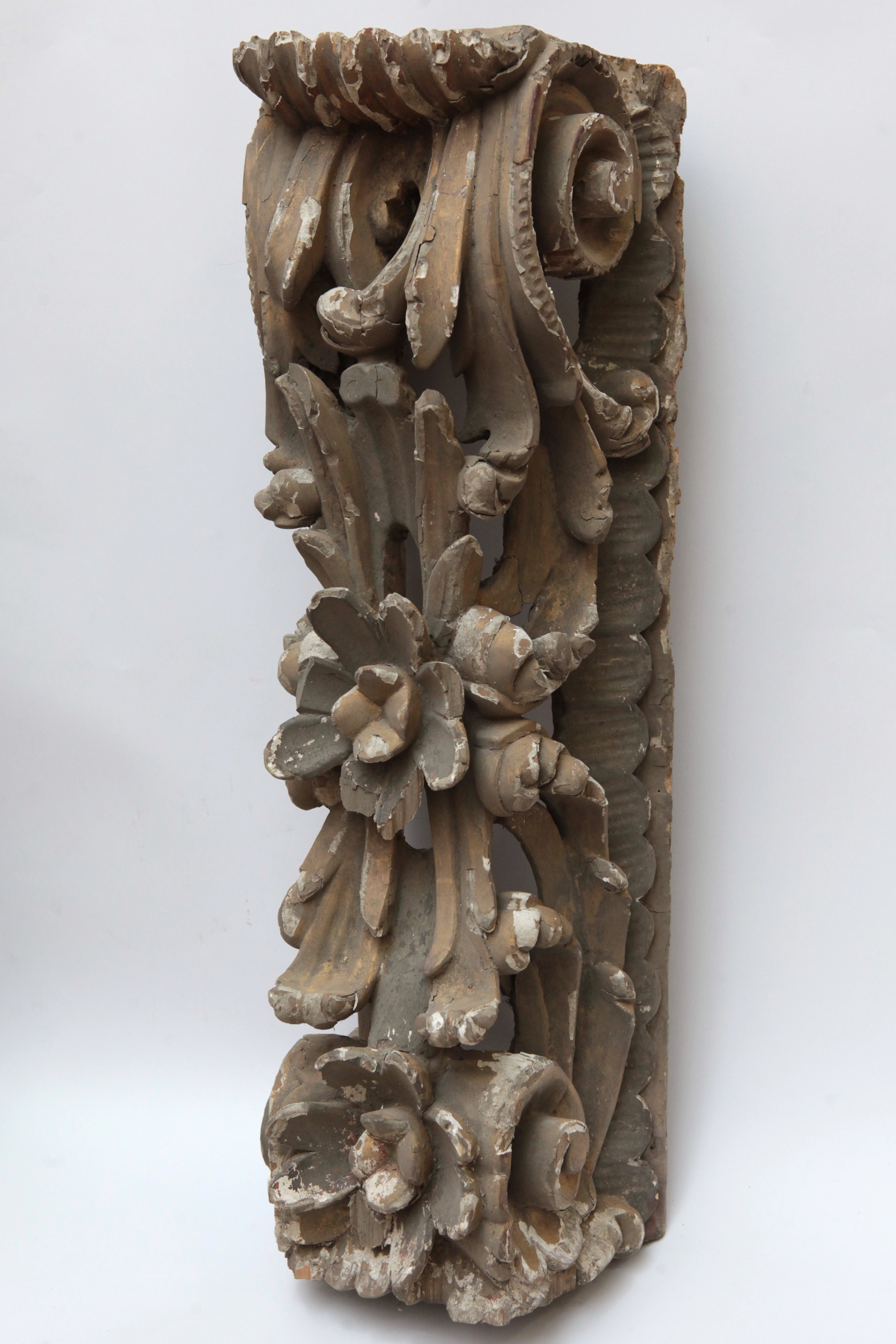 Consolă sculptată ajurată, decorată cu flori şi fructe mari; de formă dreptunghiulară.