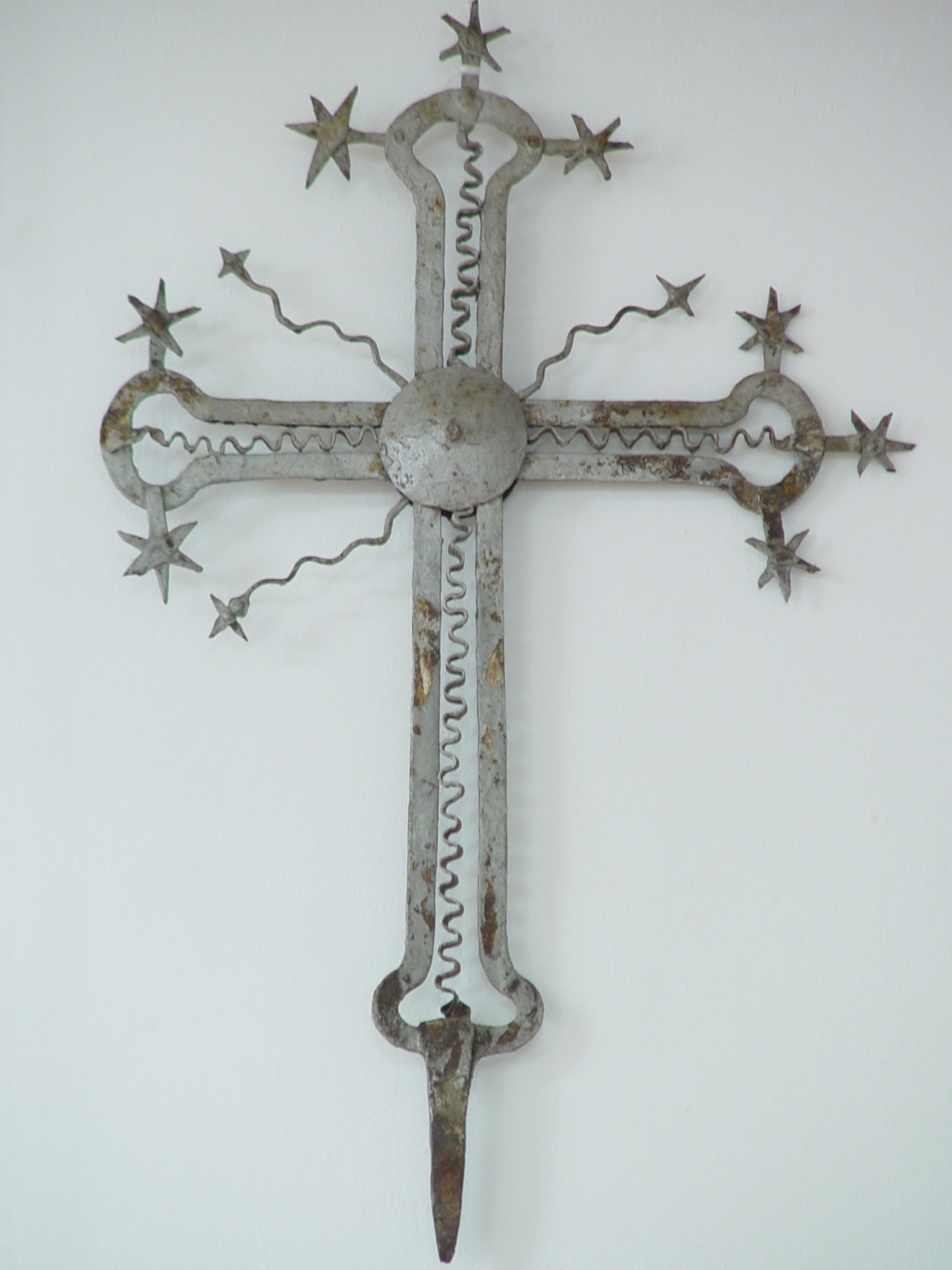 Cruce din metal, cu 4 braţe, cu decor în formă de stele şi raze. La centru - disc metalic.
