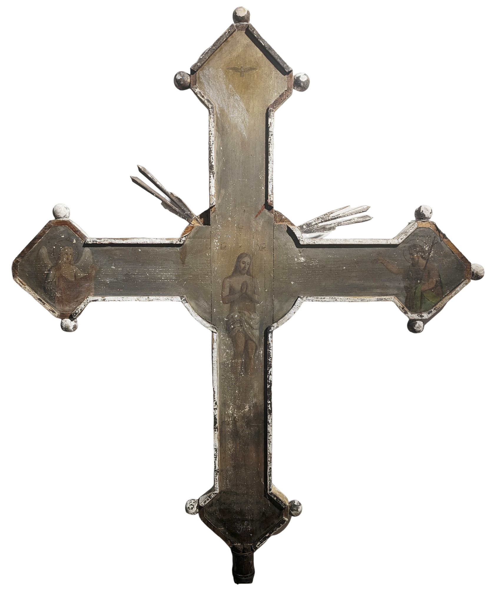 Cruce de însoțire cu pictură dublă. În partea din față Iisus Hristos răstignit pe cruce. În partea de sus Dumnezeu Tatăl, în partea stângă Maica Domnului și în partea stângă Sf. Ioan Teologul. În partea din spate a crucii avem pe Iisus Hristos botezându-se în apa Iordanului. Sus se află porumbelul ca simbol al Sfântului Duh. În partea stângă se află Arh. Gavriil iar în partea dreaptă avem pe Sf. Ioan Botezătorul.