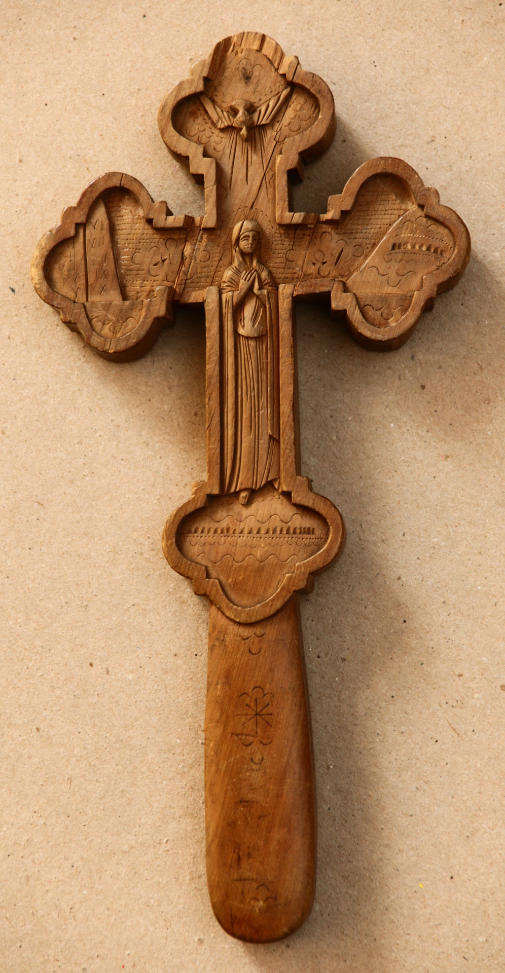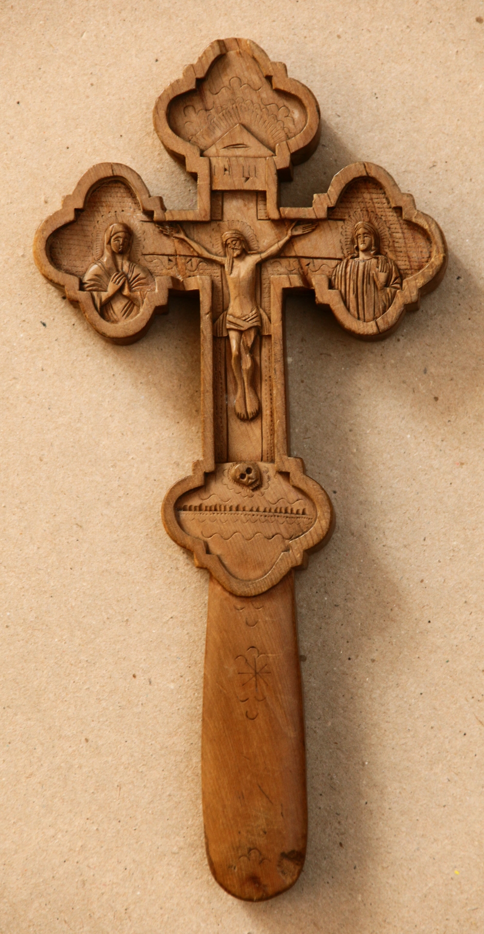 Cruce de mînă sculptată în lemn cu imagini biblice reliefate pe ambele feţe. Recto: (centru) Hristos răstignit, la picioarele lui - craniu antropomorf, (lateral) în miniatură - Maica Domnului şi Ioan Teologul (bust), (sus) Ochiul Atotvăzător. Verso: centru - Fecioara Maria în picioare, sus - Duhul Sfînt.