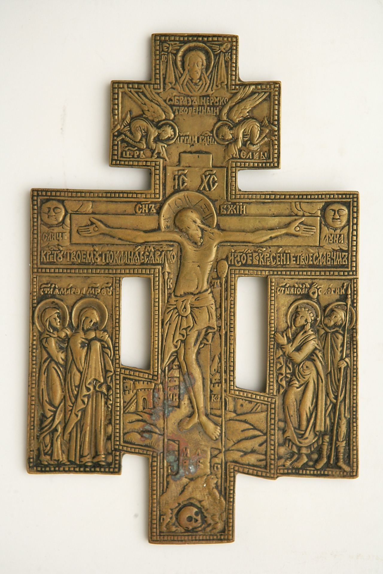 Iisus răstignit. Pe braţele laterale: Maica Domnului şi Maria Magdalena (stg) şi Ioan Teologul şi Sf. Loghin (drp). D-zeu de asupra (secundat de 2 îngeri). Soarele şi luna. Inscripţii. Jos: craniu. Pe latura înclinată: ziduri. Revers: motive vegetale.
