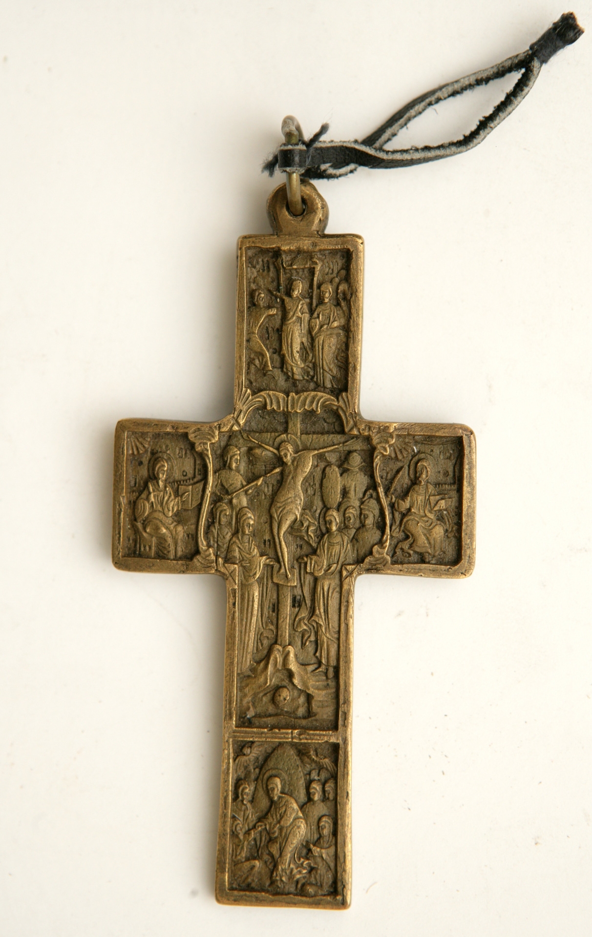 Avers, centru: Iisus răstignit; la cele 4 capete: sfinţi şi scene biblice.