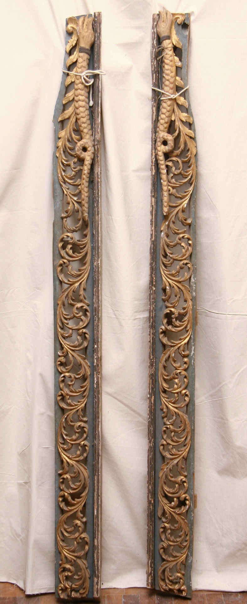 Fragment de friză sculptat, îngustat la un capăt. Decor traforat cu motive vegetale, alcătuit din ramuri cu frunze de acant. Cromatica - verde, auriu. Pe friză la capăt aplicat un șarpe sculptat.