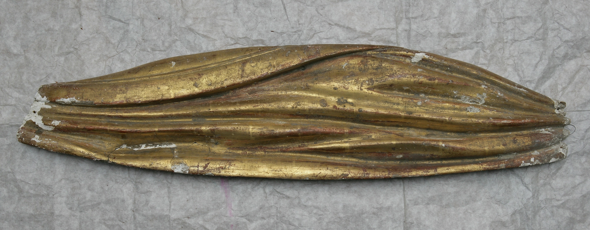 Sculptură în lemn, alungită (draperie sugerată) cu decor ondulat, reliefat. Aurită.